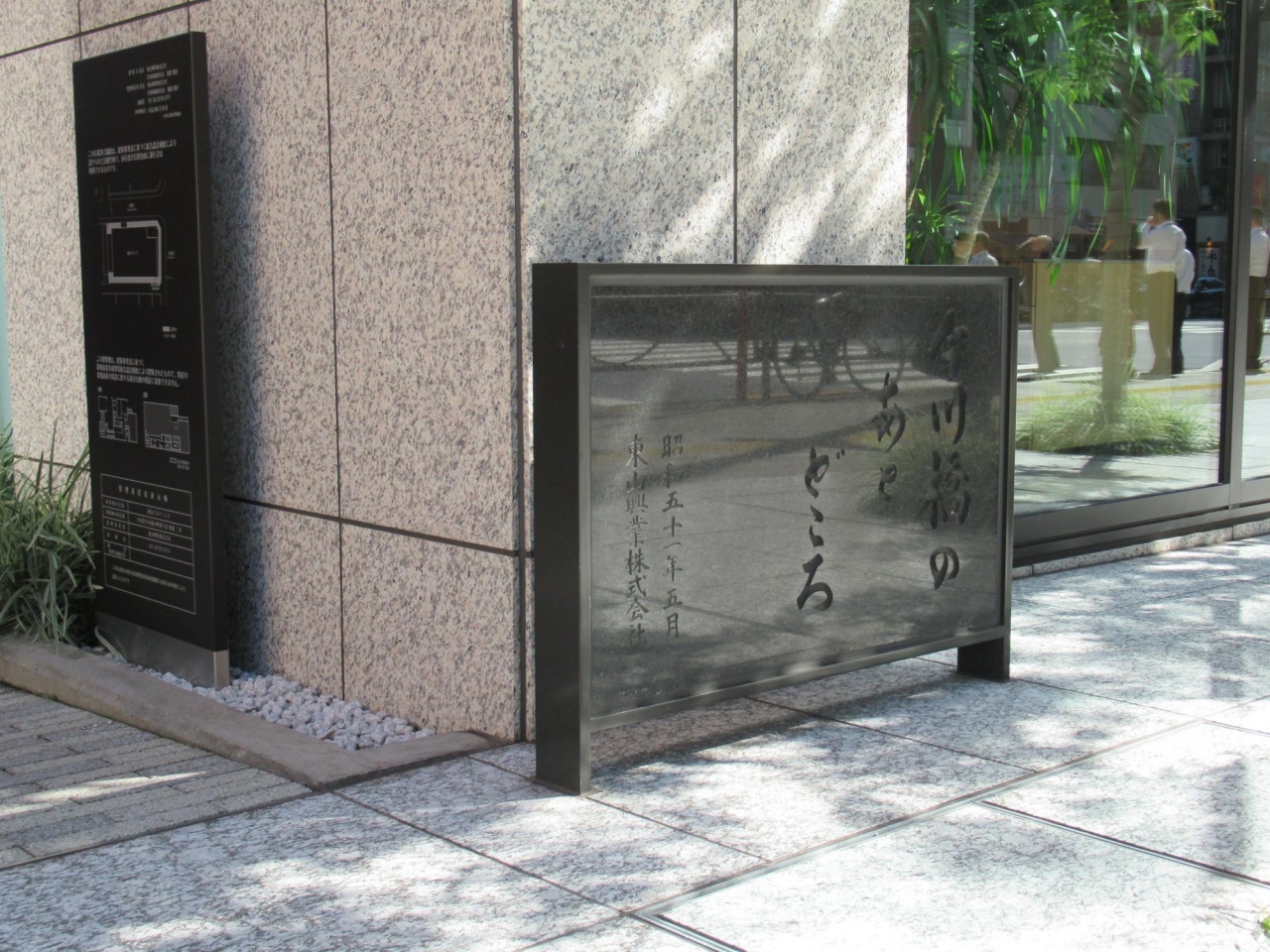 中央通りの西側に今川橋由来碑と両側に石碑があります