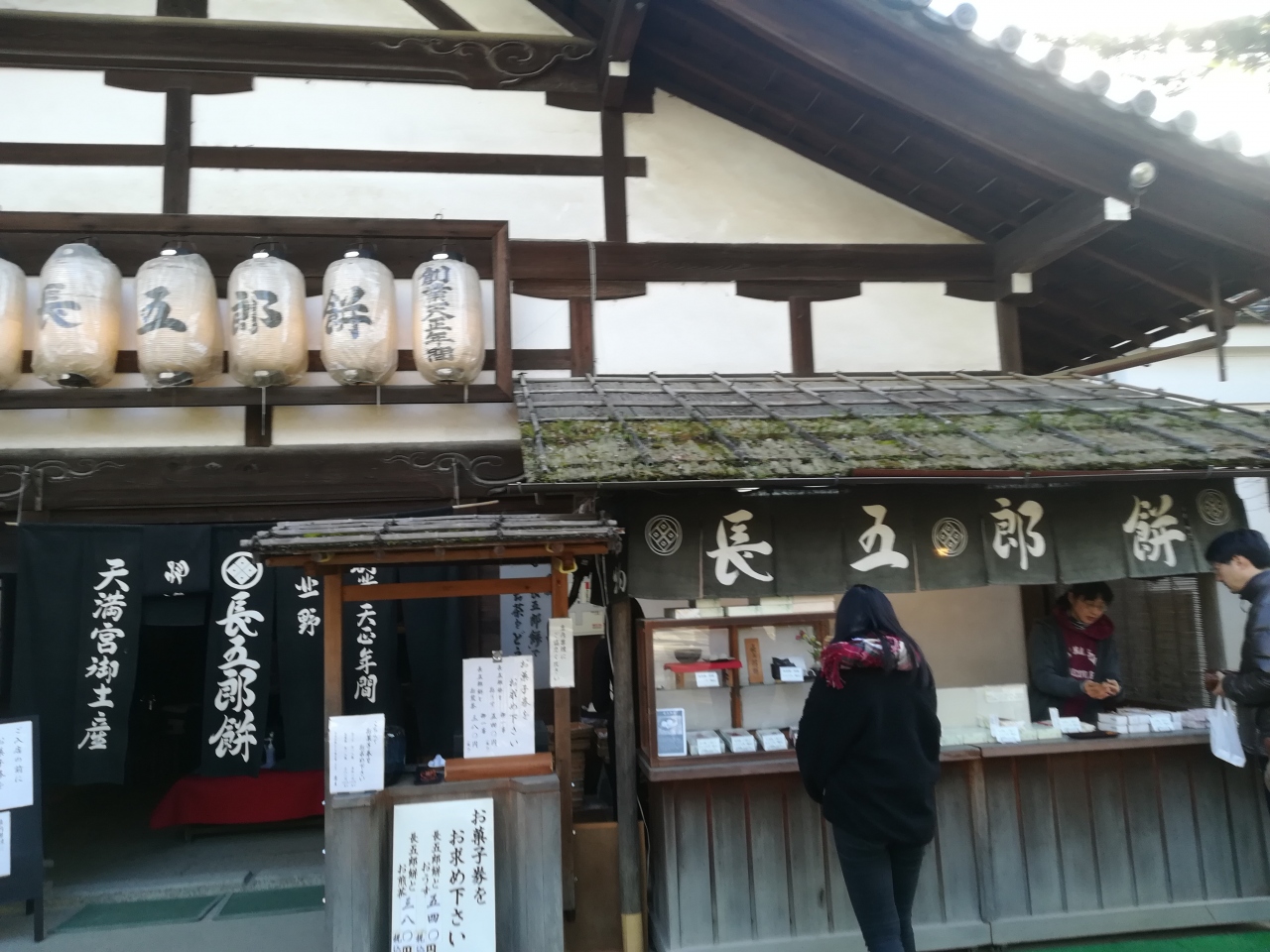 毎月25日、1月から3月までの土日と限定日のみ開いている和菓子屋さん。太閤秀吉公が開いた北野大茶会の際用いられたのがこの長五郎餅です。本店では店内にてお茶とお餅で一服できます。長五郎餅煎茶セット(長五郎餅 2個と煎茶付400円(税込))がお勧めです。