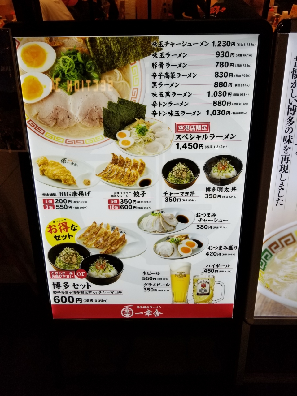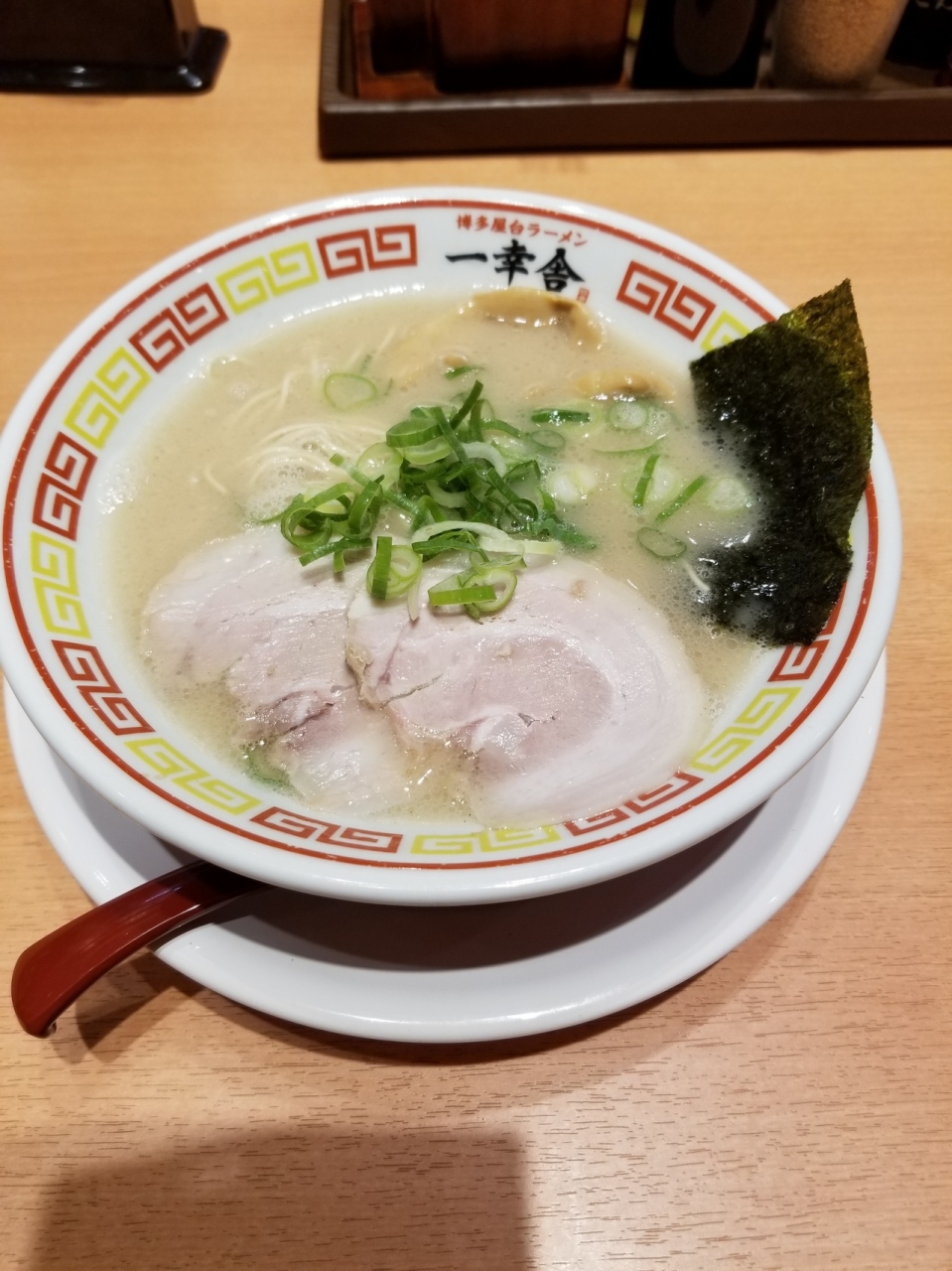 福岡空港のラーメン街道の一角にあります。客席も結構あり、回転率もいいので、飛行機の待ち時間に食するのに最適。食券を買って、店員さんに渡すと麺の固さを聞かれます。すぐに配膳されました。見た目に反してあっさりとしていて、途中で卓上にあるラーメンのタレをいれていただきました。とっても美味しく、博多旅行のしめご飯にピッタリでした。