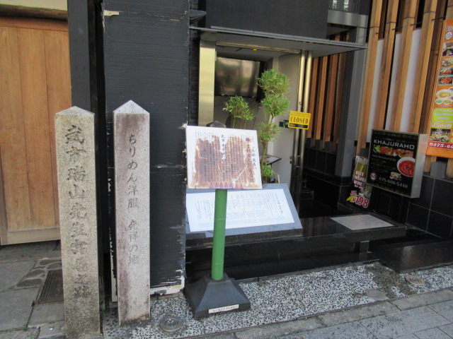 江戸時代ここ木屋町通りを流れる高瀬川の西側には全国から集まる諸藩邸が存在していて東側には藩士たちの邸宅がありました。そして押小路通には石碑「武市瑞山寓居跡」が建っていますが横に並んでこの「ちりめん洋服発祥の地」も建っています。