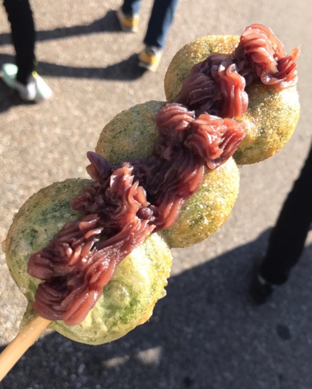 揚げよもぎが串に刺さっていて美味しいあんこがたっぷりのっています。