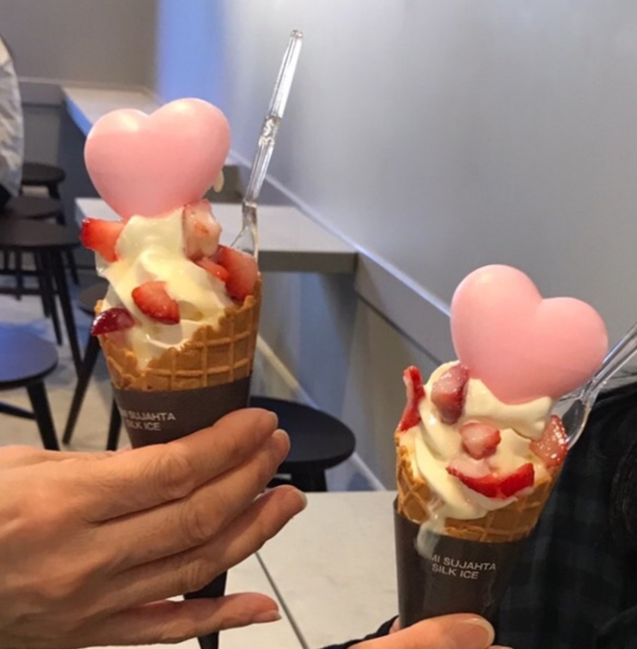 ピンクのハートの最中がかわいいソフトクリームでした。