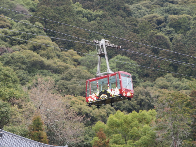乗り場は、岩国美術館になります。ロープウエイは、どの地方に行っても眺望抜群ですが、ここのは特にいいです。上がっていく途中に、目加田住宅の全景が綺麗に見えます。お屋敷を上から見られるということはなかなかないですね。
