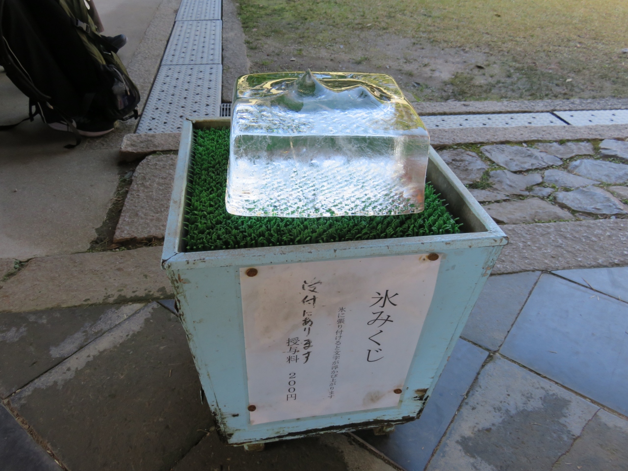 お参りして帰ろうとしたら、氷の塊が置いてあるのを発見。氷に張り付けると文字が浮かぶ氷みくじが名物のようです。かき氷もあるようで不思議な神社です。
