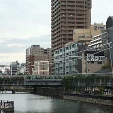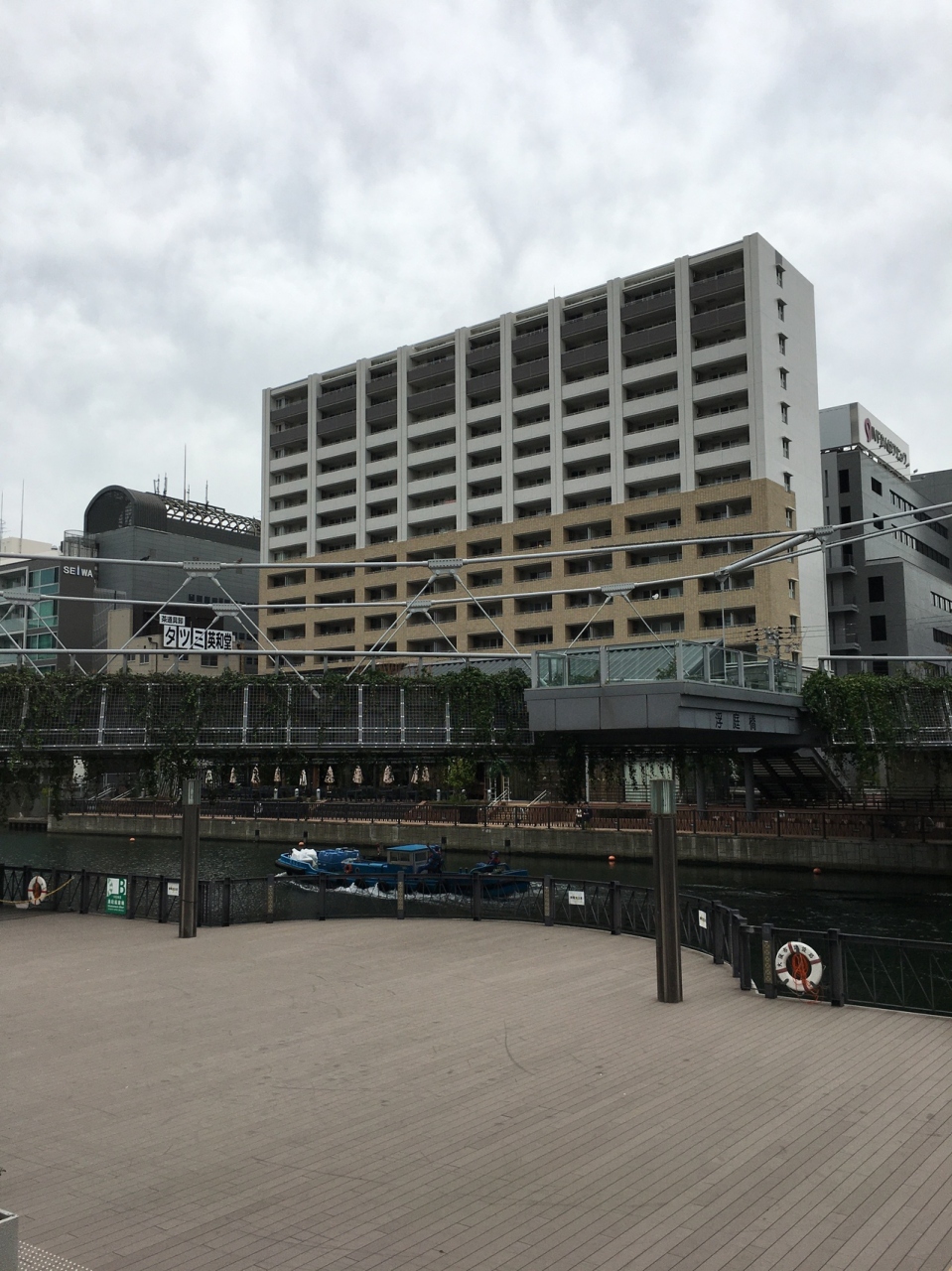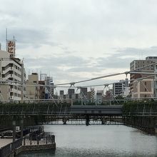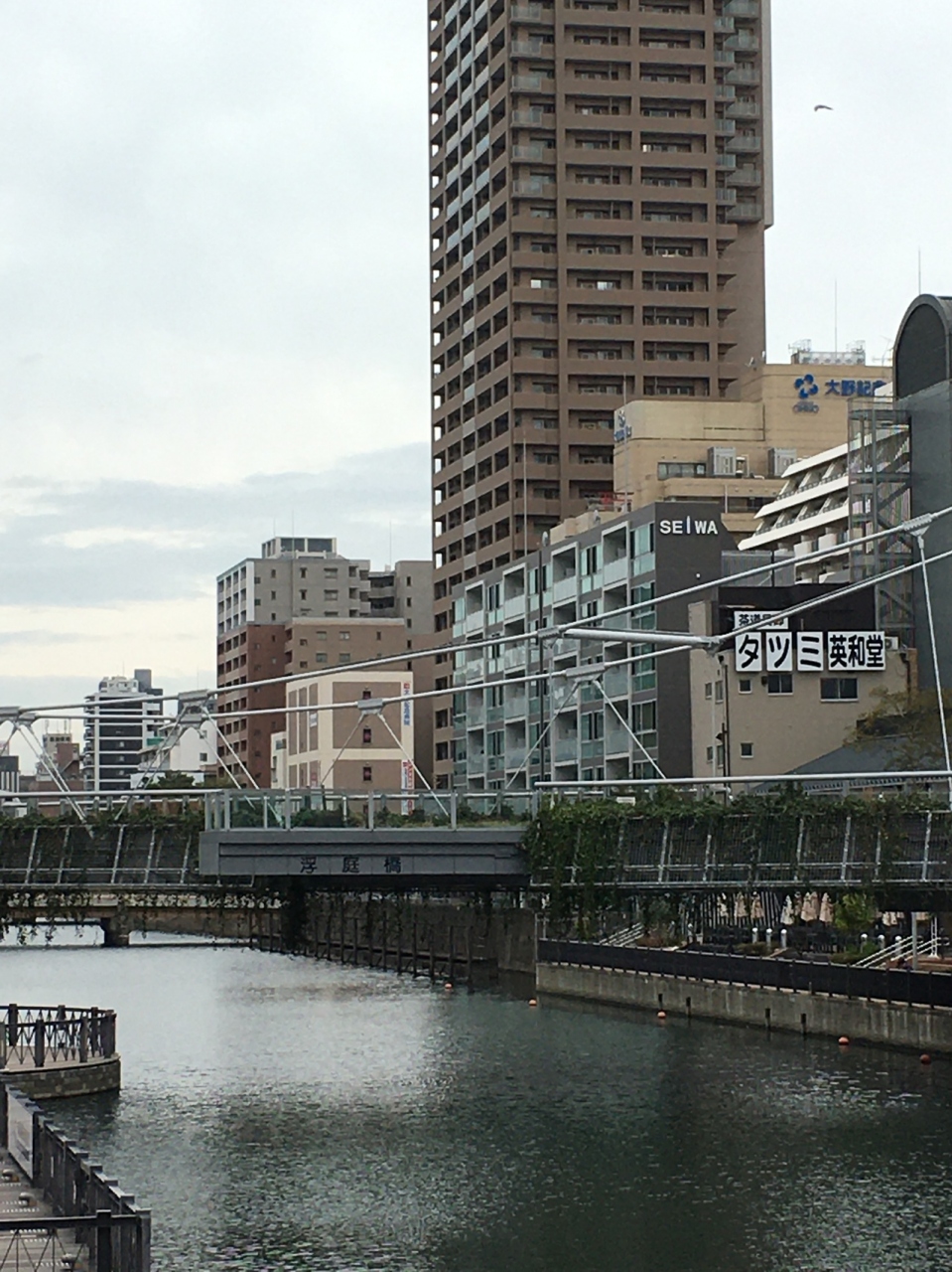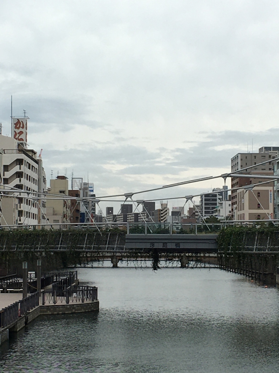 端の側面にはつたの葉のような物があり、堅苦しい端ぽくないのが良いです。橋は上部を左右から細い鉄筋で支えているような感じで、橋を渡っているときよりは、少し遠くから橋を見たほうが雰囲気が良かったです。橋の下は道頓堀川が流れ遊歩道が横にあります。