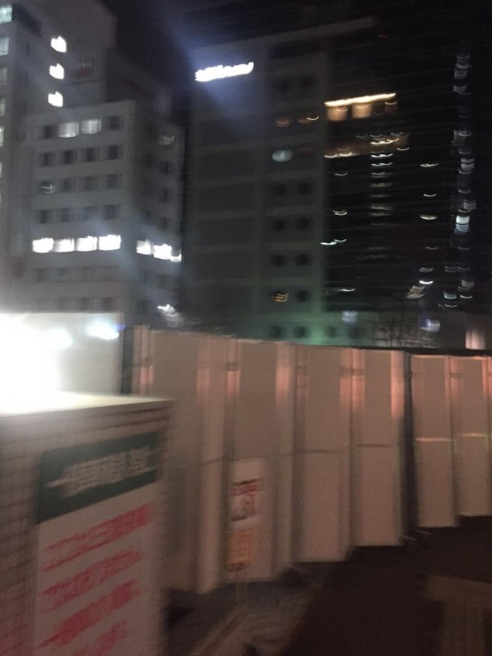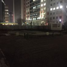 工事の中を覗くと、花のない時計がぽつんとありました。