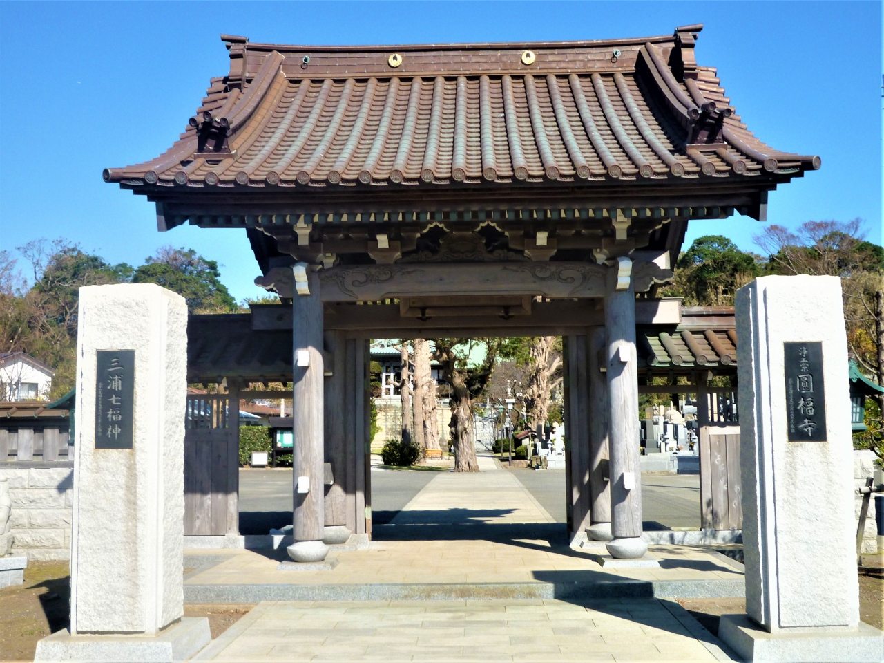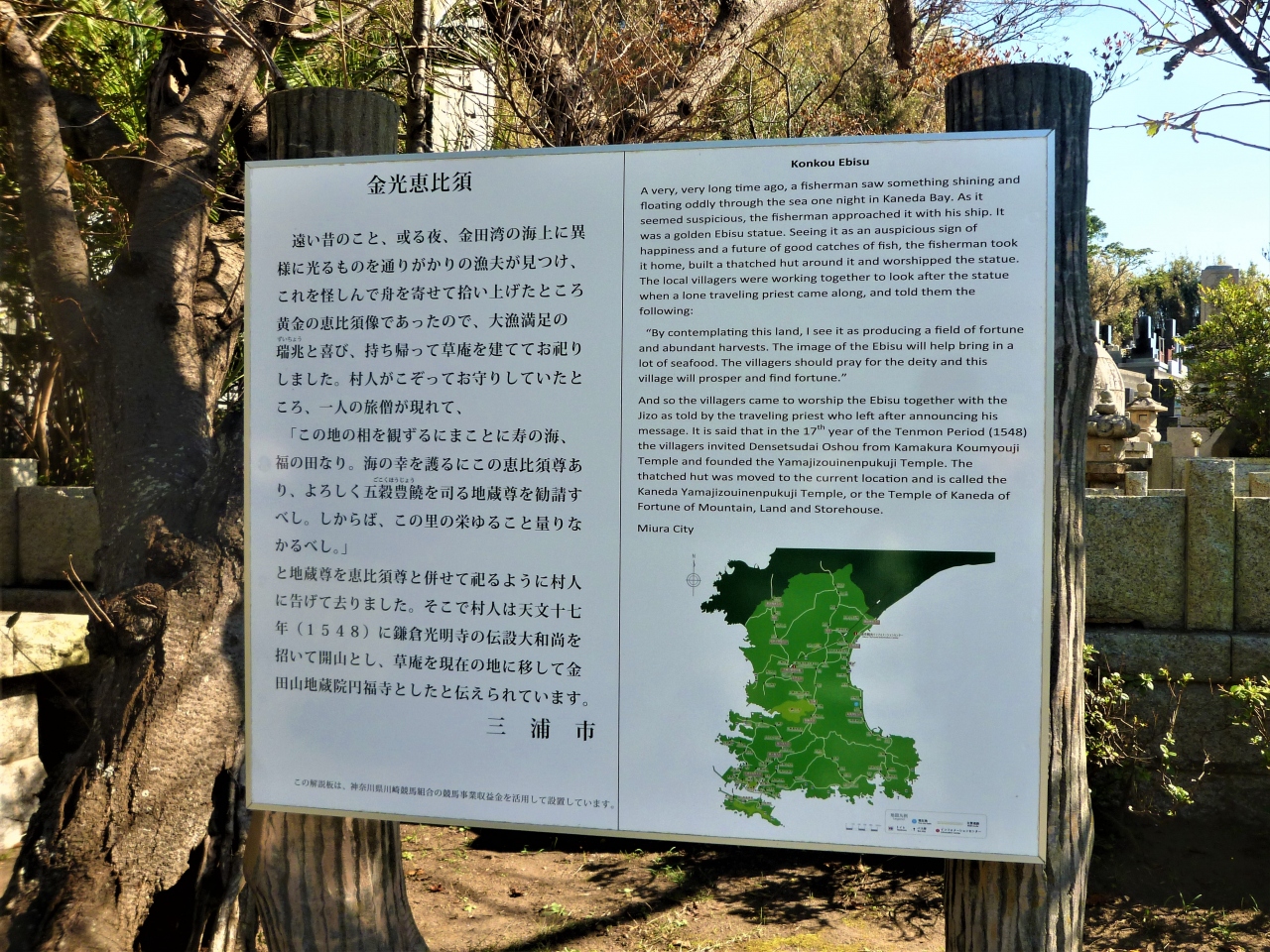 三浦海岸の海岸通り(R134号)から県道(215号)に右折し金田湾の小道(旧道?)を通ると[圓福寺]でした(専用駐車場付き)。総門にお寺の名前と`三浦七福神`の一対の石塔が! 本尊の`阿弥陀如来`に参拝しました。金光恵比寿縁起板には`恵比寿様とお地蔵様を祀ることで里が栄える`♪ 境内には銅葺きの本堂/立派な鐘楼/観音様/七福神様/大銀杏や槙の老木/それに土地住民のお墓々があって参拝/お辞儀を。 備考)寺額には`金田山`が;金田山があって地名金田/金田湾が、または地名から`金田山`が(^^?)
