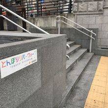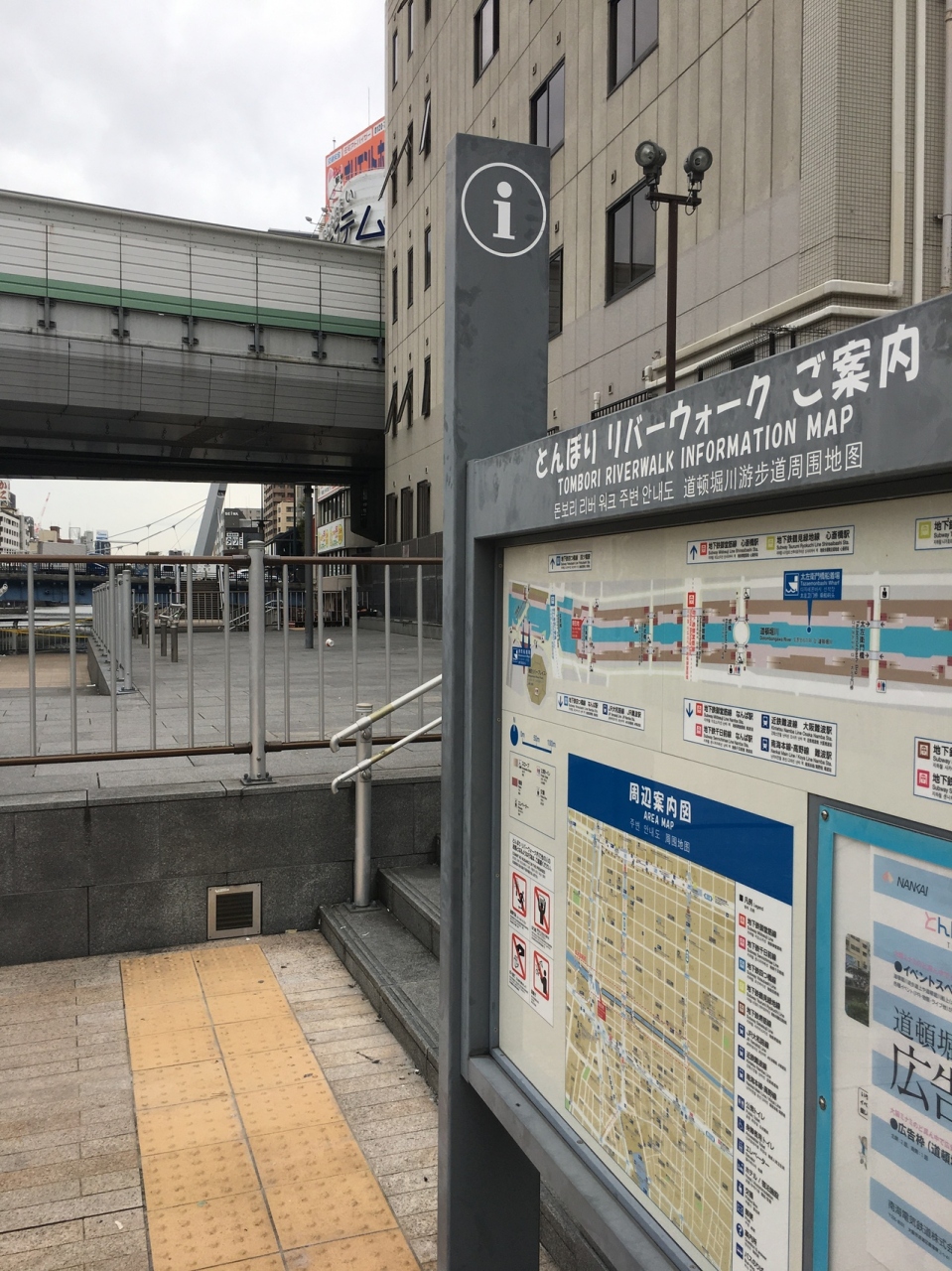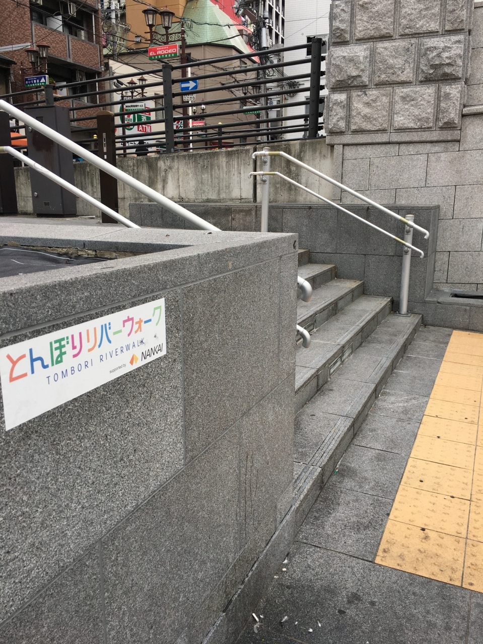 道頓堀川に沿った遊歩道のような感じで、川と道の高さがあまりないので川を直ぐ横に見ながら歩きました。舗装された歩き安い幅が狭い道で、歩いているといくつかの橋を超えることとなります。繁華街の道頓堀まで徒歩5分程のエリアにありますが、静かな場所でのんびりできました。
