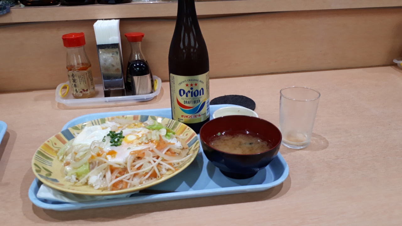 がある。9時からの営業で11時までは日替わり弁当、モーニングセット、カレーライス、飲み物、つまみ類だが11時からモーニングセット以外なんでも、だから9時からだと10ぐらいだが11時だと行列が出来直ぐ満員になる人気店である。全て券売機で11時で店員の人がセットし直し。カウンターで最後のオリオンビール生の瓶(ジョッキーなし)沖縄そばと野菜チャンプル(ライス付)頼む。1,352円安いみんな美味しい。