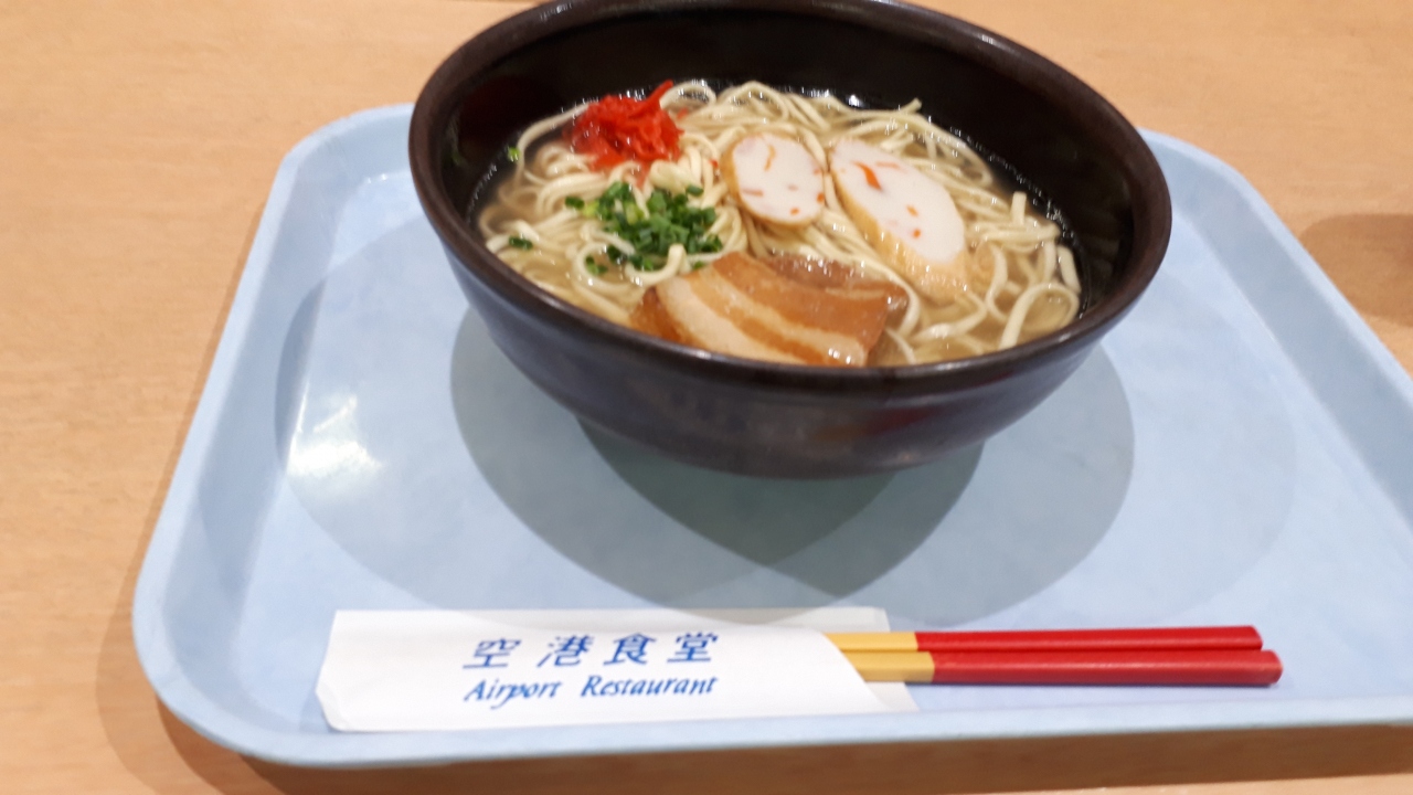 沖縄都市モノレール(ゆいレール)那覇空港駅で改札口をでて案内板どおりエスカレーターで20m乗り突き当りの案内板で左がJAL右がANAに分かれ左側へ曲がりエスカレターで1階へここは2階であった。下りてから真っすぐレンタカーを目指し行くと一番奥に空港食堂