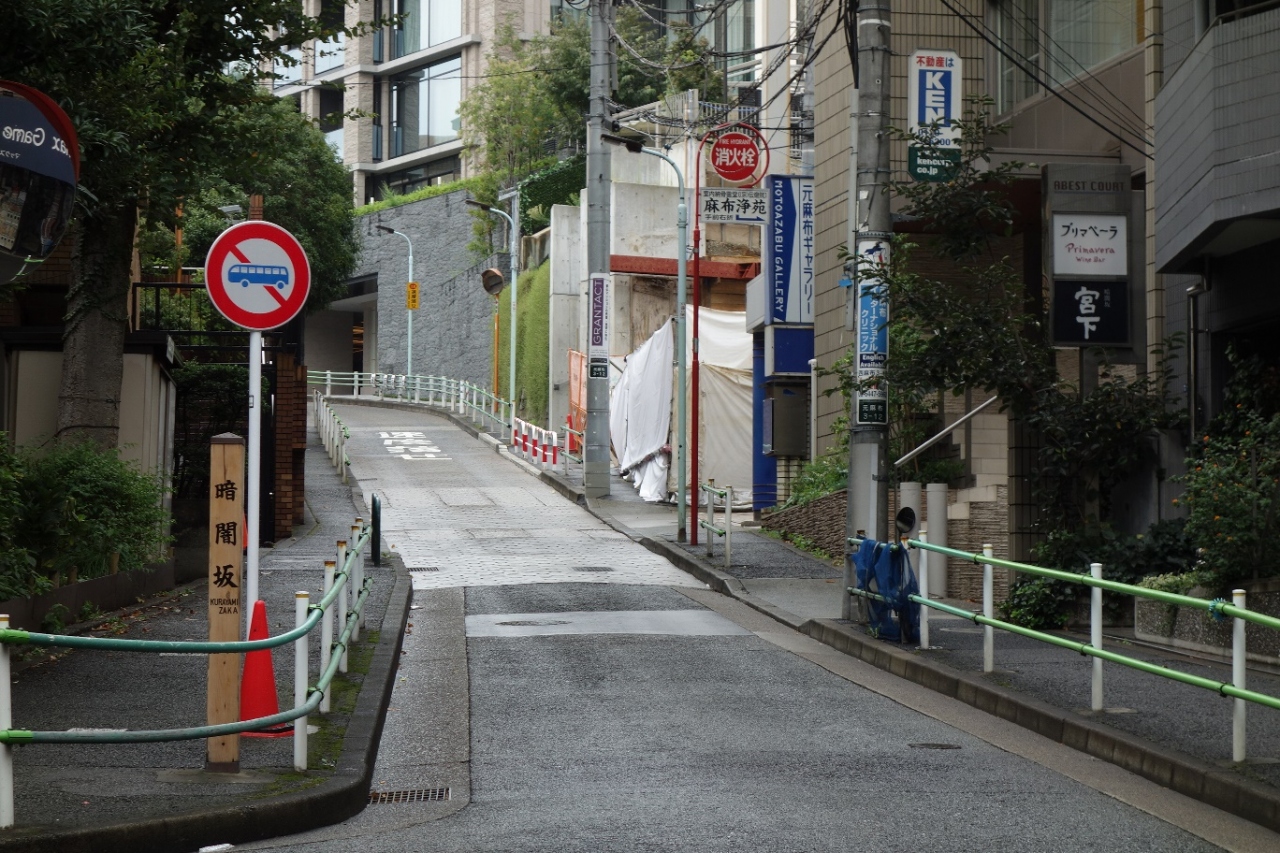麻布あたりのエリアを散策中こちらの坂道を通りました。麻布十番駅近くから麻布十番商店街を西の方へ歩いていくと暗闇坂の入り口が有ります。今では都会らしい建物が並ぶ地域ですが、かつては木が生い茂る暗い坂道だったのだそうです。