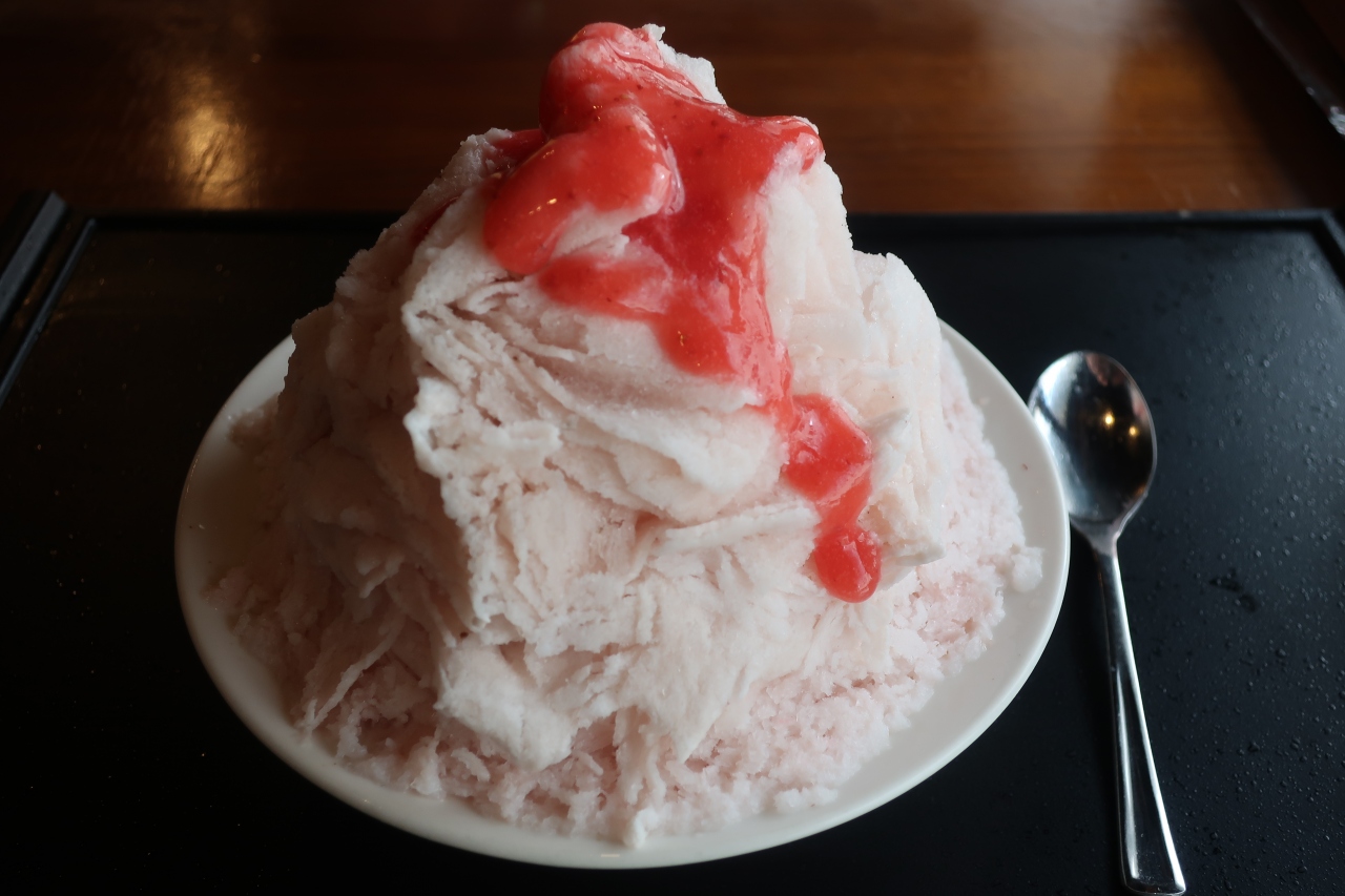 三条油小路の交差点角にある町屋の2階に雪ノ下の京都本店はあります。開店前に行ったので開店後直ぐに入店できましたが、その後続々と人が来る人気店です。パンケーキが有名なのですが、夏なので頂いたのはかき氷。南アルプス白桃氷と苺ミルクを注文。かき氷と言うかシャーペット状になっており、キーンと頭に来る冷たさとフルーツの味が美味です。店内の雰囲気も町屋を改装しただけあり、雰囲気も良く、お薦めのお店です。
