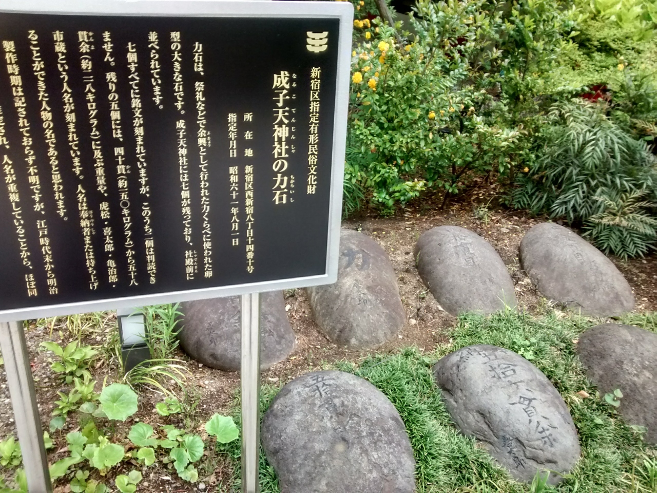成子天神社の力石は7個ありますが、そんなにめちゃくちゃ重そうでなく、持ち上げられるかなという感じでした。成子天神社の力石の説明板もあって、比較的簡単に見つけられると思います。成子天神社の力石よりも、建物がおすすめです。