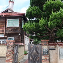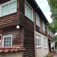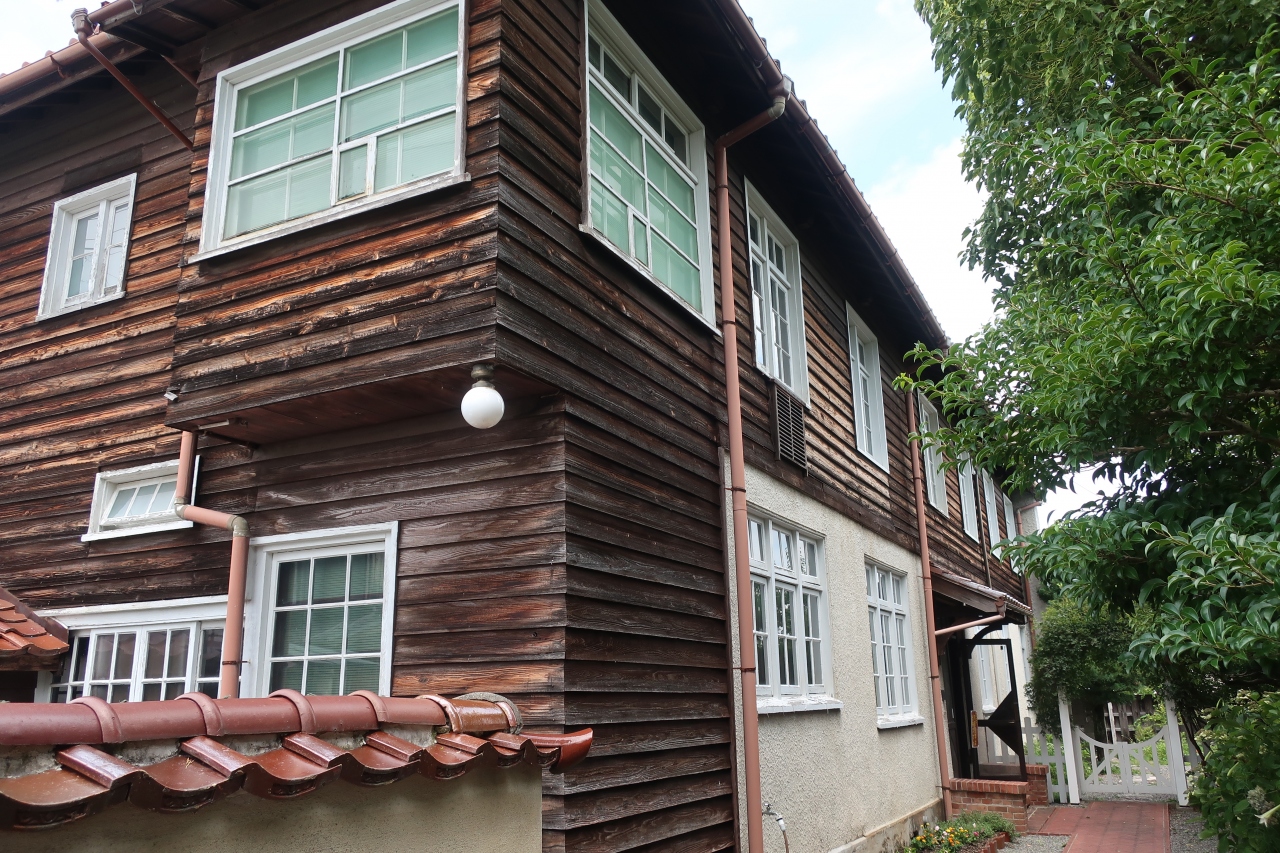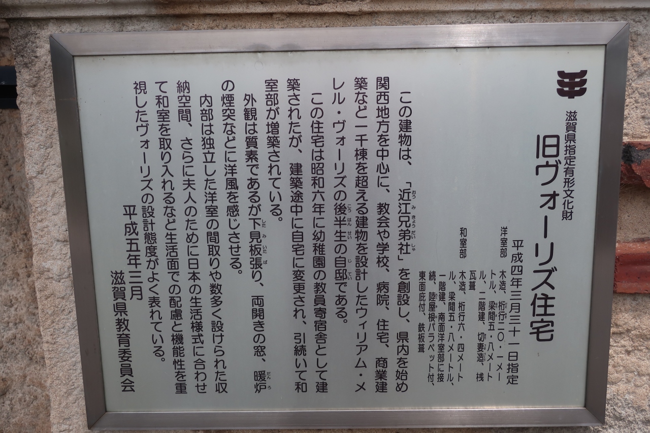 近江兄弟社中高学校近くの滋恩寺町通り沿いにヴォーリズ記念館はあります。アメリカから英語教師として近江八幡の来日し、数多くの西洋建築を日本で手掛けたウィリアム・メレル・ヴォーリズの住宅を記念館にしたものです。予約をすれば内部を見学できるのですが、今回は予約なしなので、外観からの見学。板張りの外壁に白い煙突が立つ非常に質素な造りの洋風建築で少し驚きでした。