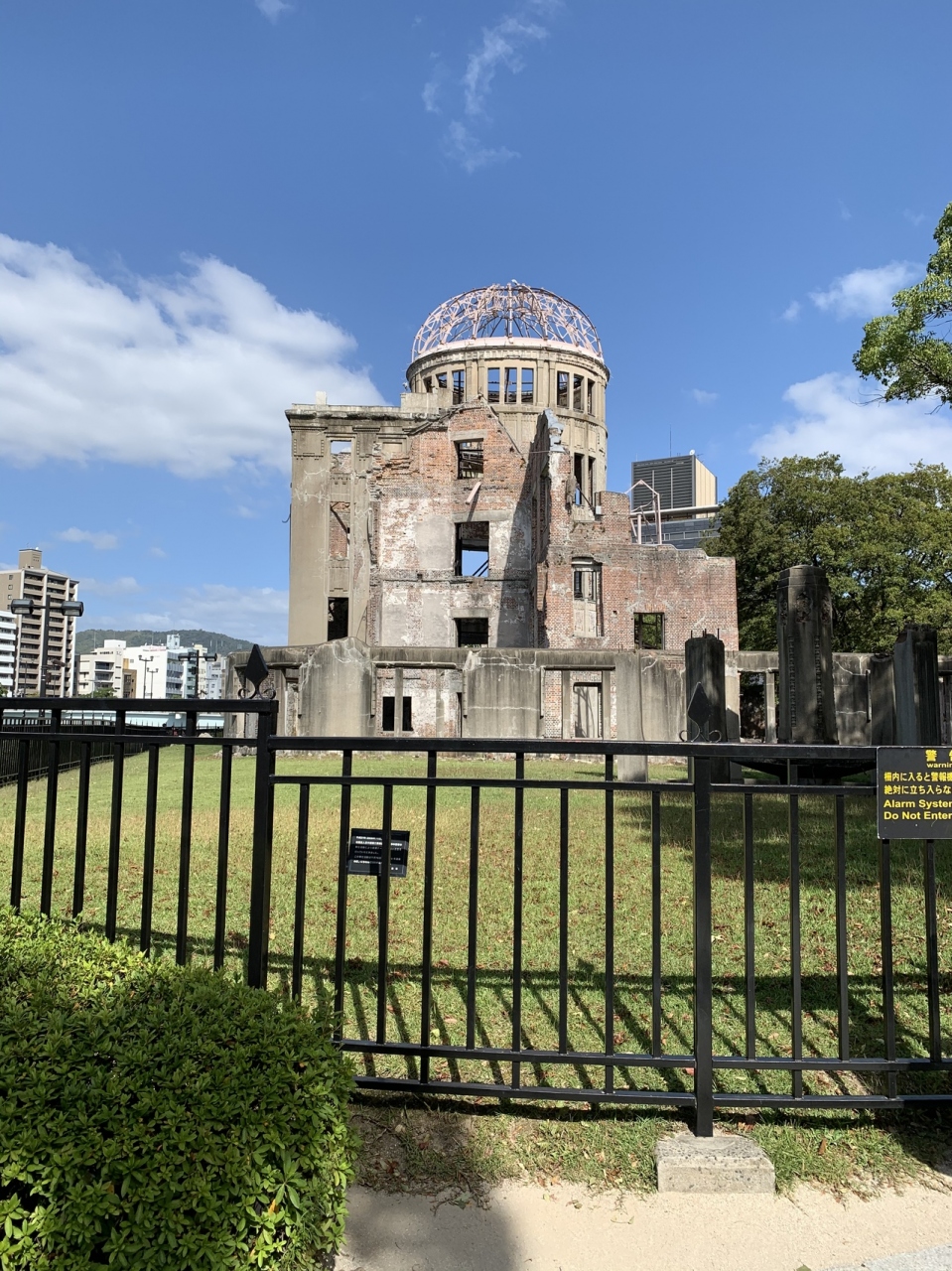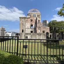 原爆ドームはもともと新商品発表の場として使われていた建物のようで、バウムクーヘン発祥の場所でもあるようです。なので広島のお土産屋さんに行くとバウムクーヘンのお土産が目立ちます。周辺の建物は跡形もない状況だったの対して、原爆ドームは建物の形が特徴的だったため原型を残したそうです。