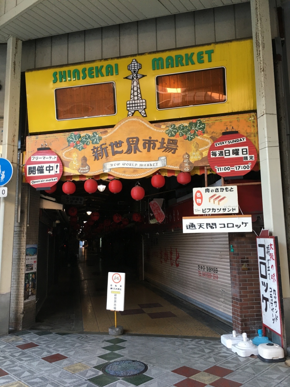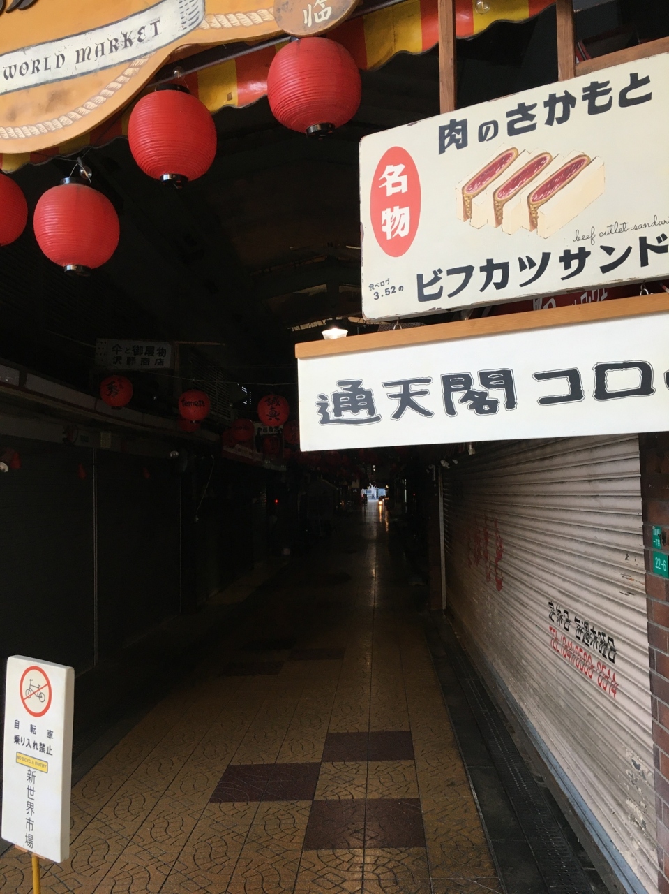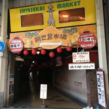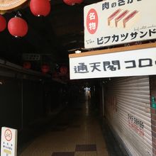 通天閣から徒歩2分ぐらいの場所にあります。屋根があるアーケードになっていて、薄暗いアーケードなので最初は入りにくく、シャッターが閉まっている店もいくつかありました。出入り口は2箇所で100メートルぐらいの長さで、出入り口横の肉屋のコロッケはオススメです。
