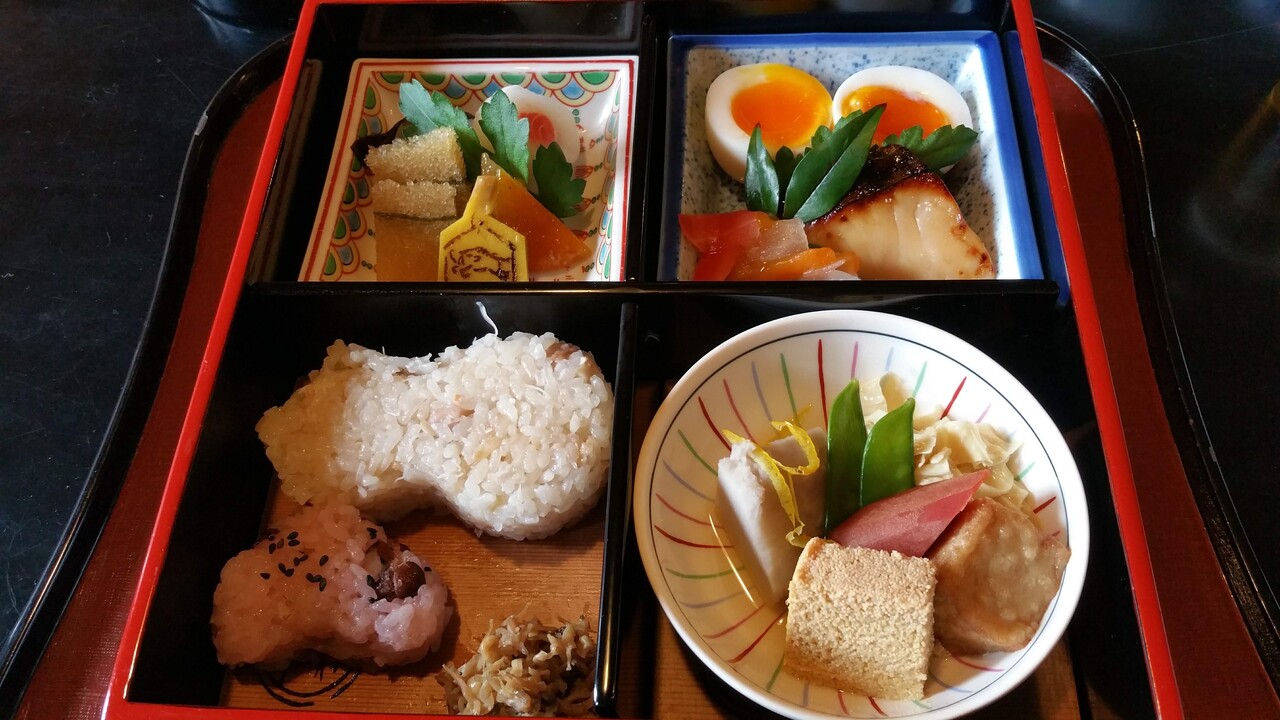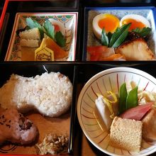 松花堂のようなランチで、白味噌の椀ものがついています。
