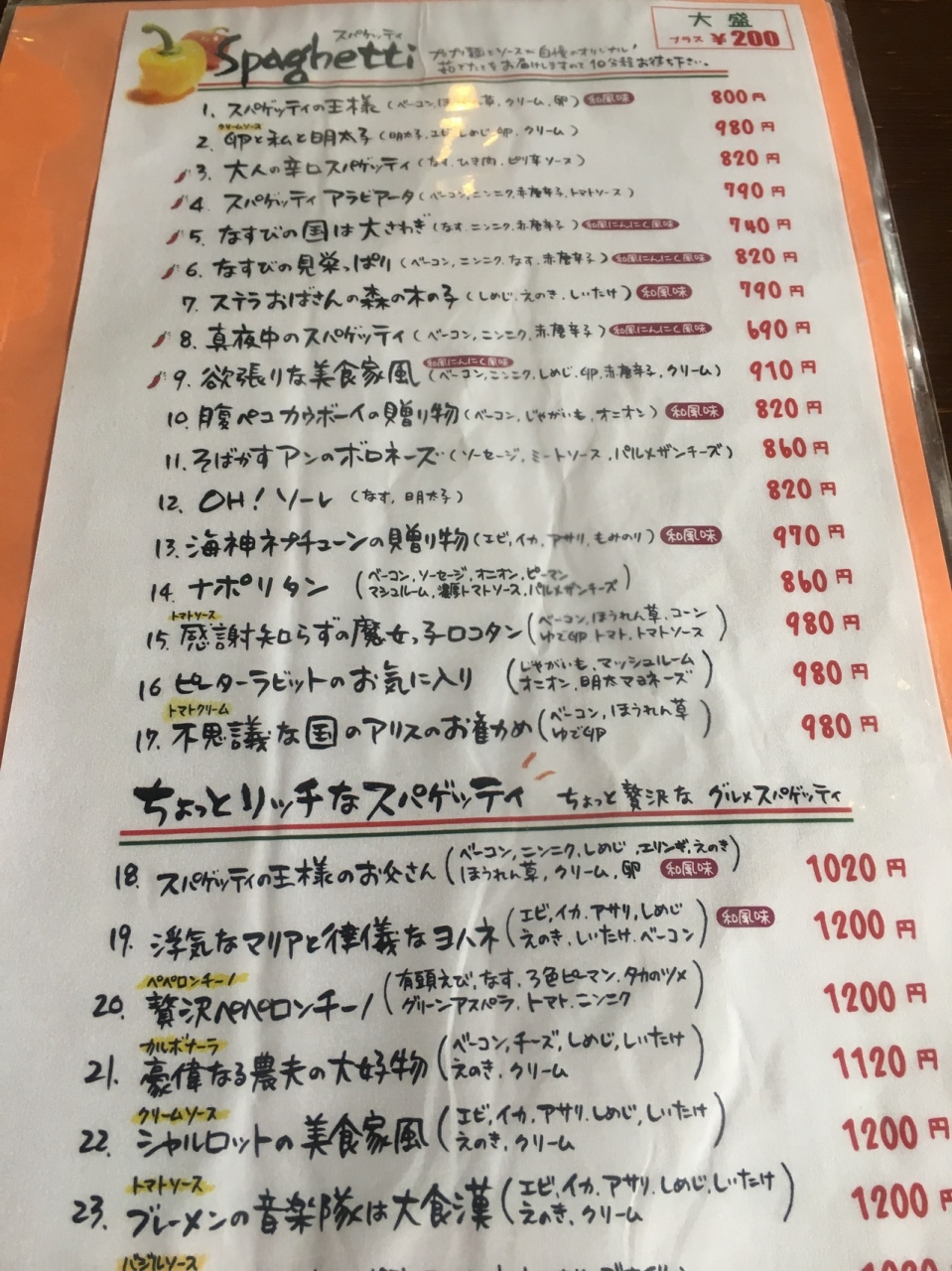 メニューはというと、パスタの種類がすごい!迷います。そして、ちょっとおしゃれなネーミングです。