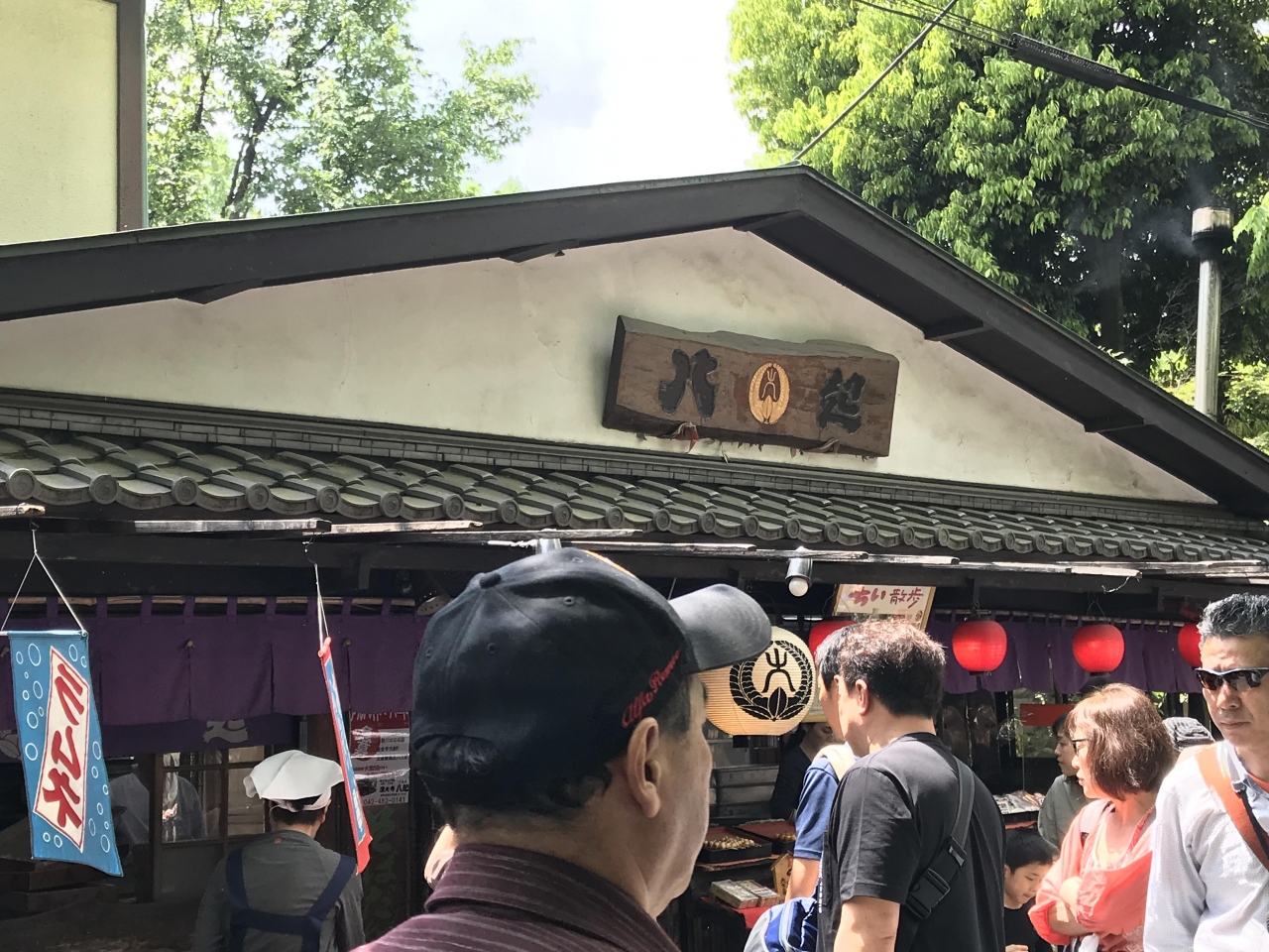 深大寺の門前のお店です。やたらと人がたむろしているのでお土産屋さんかと思いましたが、皆さん目的は団子やお持ちでした。店先の長椅子に座って団子をいただきました。お茶も一緒にいただけるのでありがたかったです。味はもちろんおいしかったのですが、青空の下で食べる団子は最高でした。