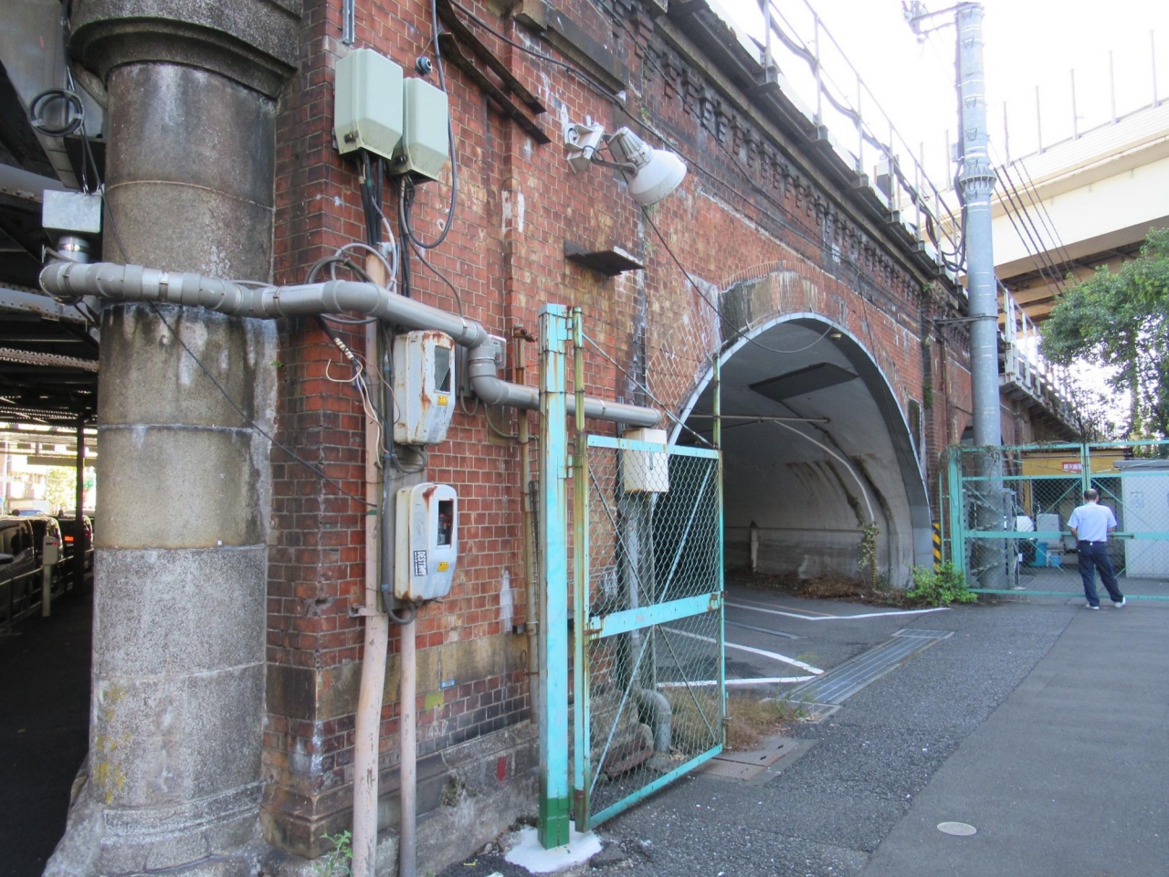 が、龍閑橋架道橋 (北) 側から見ると、高架橋は、2連のアーチ形の煉瓦壁で車庫になっているようです。