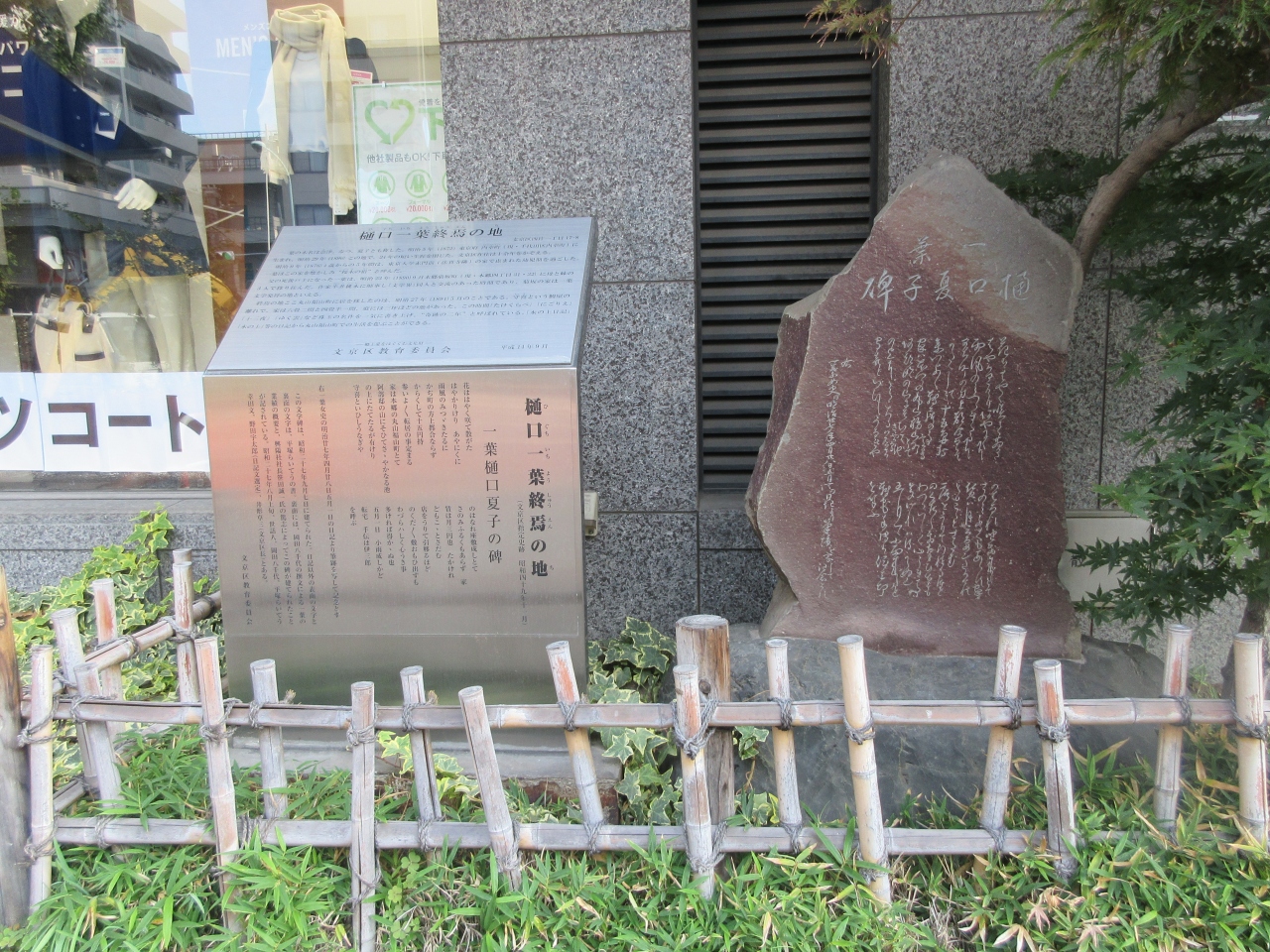 白山通り西片交差点から200m北へ歩いたところにある服量販店の緑地帯に説明板があります。樋口一葉が亡くなる前2年間ここに住み名作を生みだしました。説明板に誕生から亡くなるまでの居住地について記してありました。今までそれぞれの地を訪れてきたので終焉の地に来ることができてよかったです。赤茶色の素朴な石に日記が彫られている文学碑があります。1952年に平塚らいてうたちにより建立されたものです。磨かれた石ではないところに若くして亡くなった樋口一葉らしさを感じました。