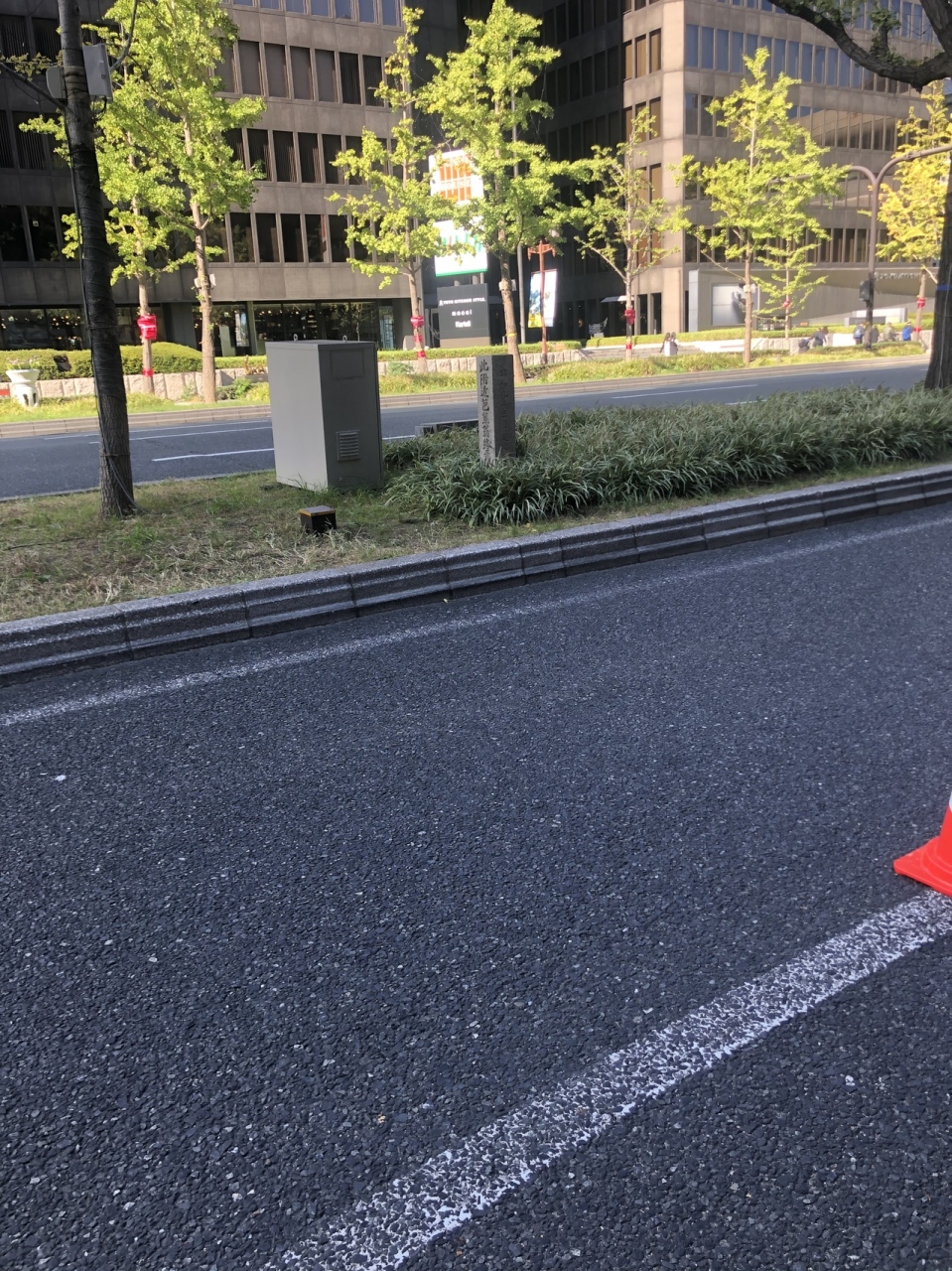 御堂筋線本町駅から御堂筋をやや南に行ったところにドトールがありますが、さらに御堂筋の本線と側道の間のエスケイプゾーンにある碑です。歩道に立っていないため、注意して見ないと見逃すと思います。こんなスポットなので見逃しても良い地味なスポットです。