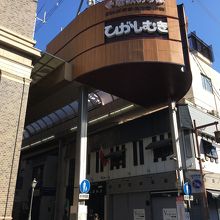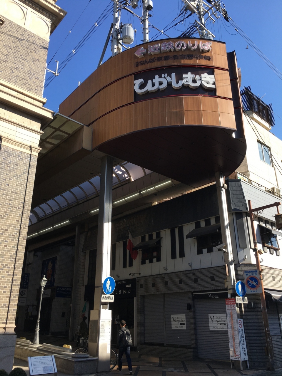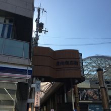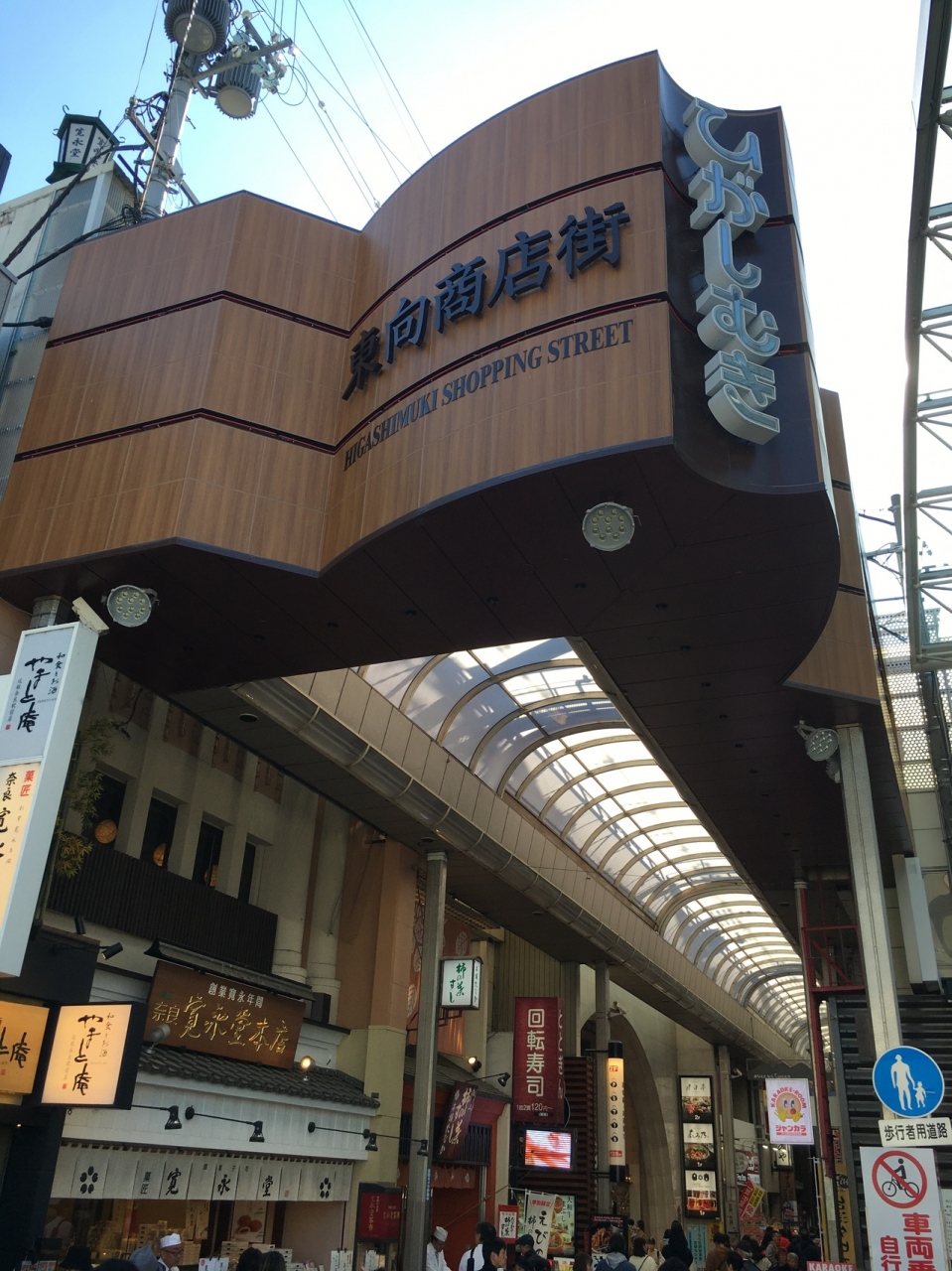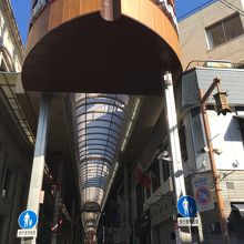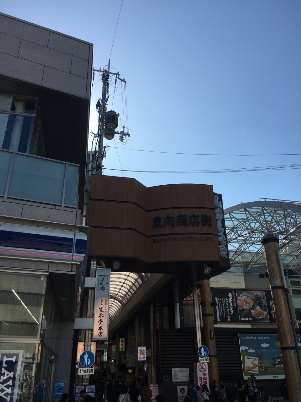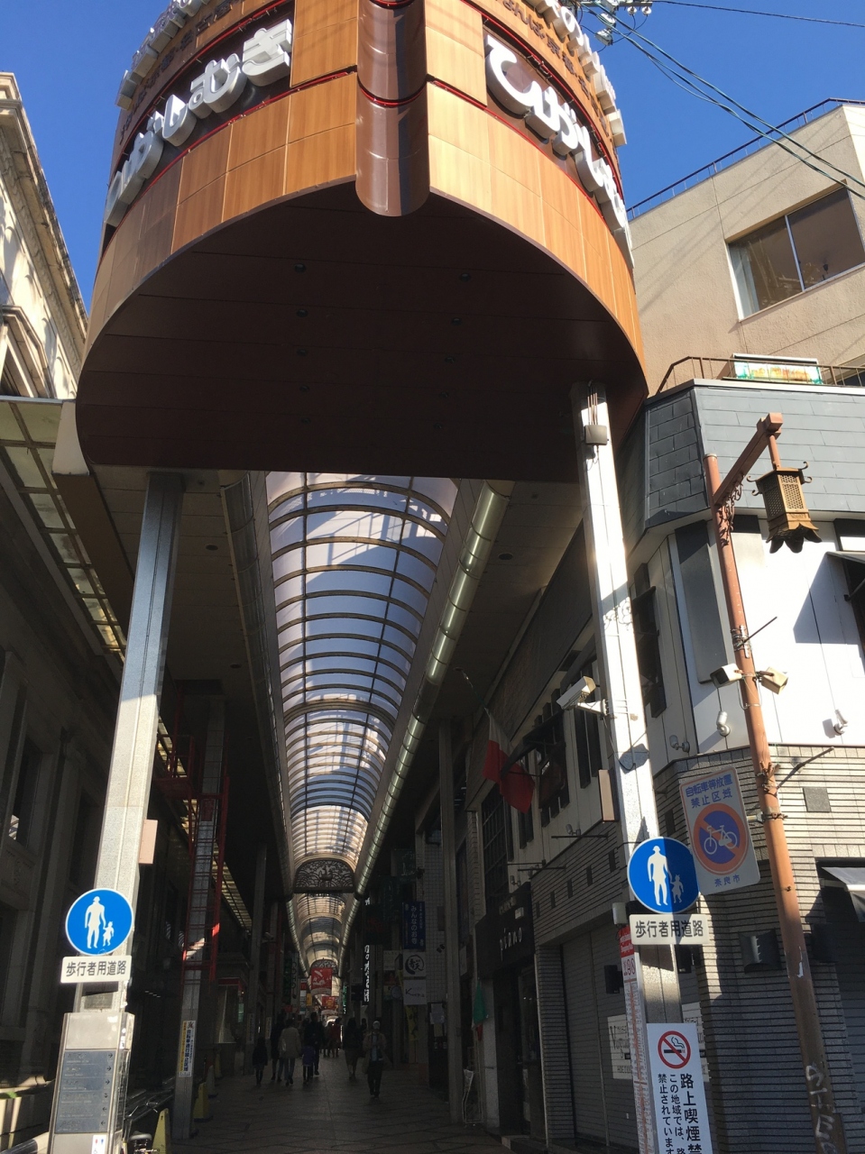 近鉄奈良駅の目の前からはじまる商店街で目の前のコンビニが混み合っていて、横の覚栄堂の大きなどら焼きは実物です。天井が高くアーケードになっていて、店が狭く人が多いので少しごちゃごちゃ感がある通りでした。