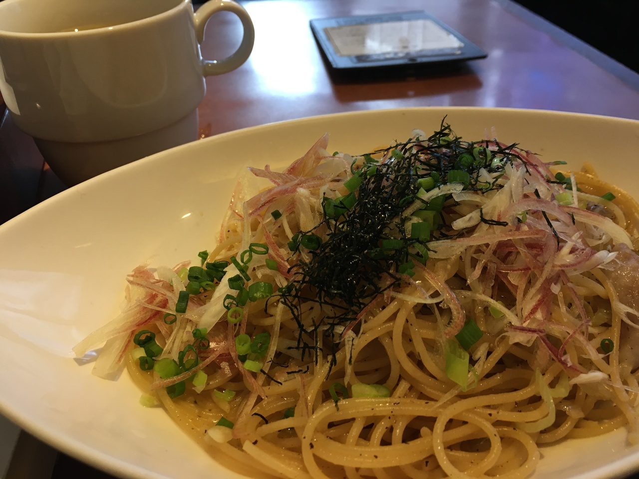 キリンシティに来ているのだからランチビールをと思わないではなかったが、豚とネギのパスタにスープ&ソフトドリングバーを付けて、スープを堪能する方向で。サイコロ状の大根がたっぷり入ったコンソメスープをのらりくらりと堪能していると、パスタ登場。ちゃんとアルデンテでミョウガが効いていて美味しい。だが、こちらの料理は基本的にビールと共に味わうことを前提にしている為、全体的に味付けが濃い目。ビールを注文しなかったことをちょっとだけ後悔。
