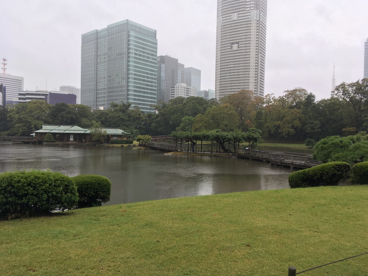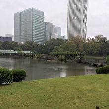 潮入の池の岸から中島の御茶屋までを、途中にある「小の字島」を経由して結ぶ「お伝い橋」。長さ118メートルあり、総檜造り。平成24(2012)年に改修され、まだ新しさが残る。藤棚の下も通り、季節には見事だろう。