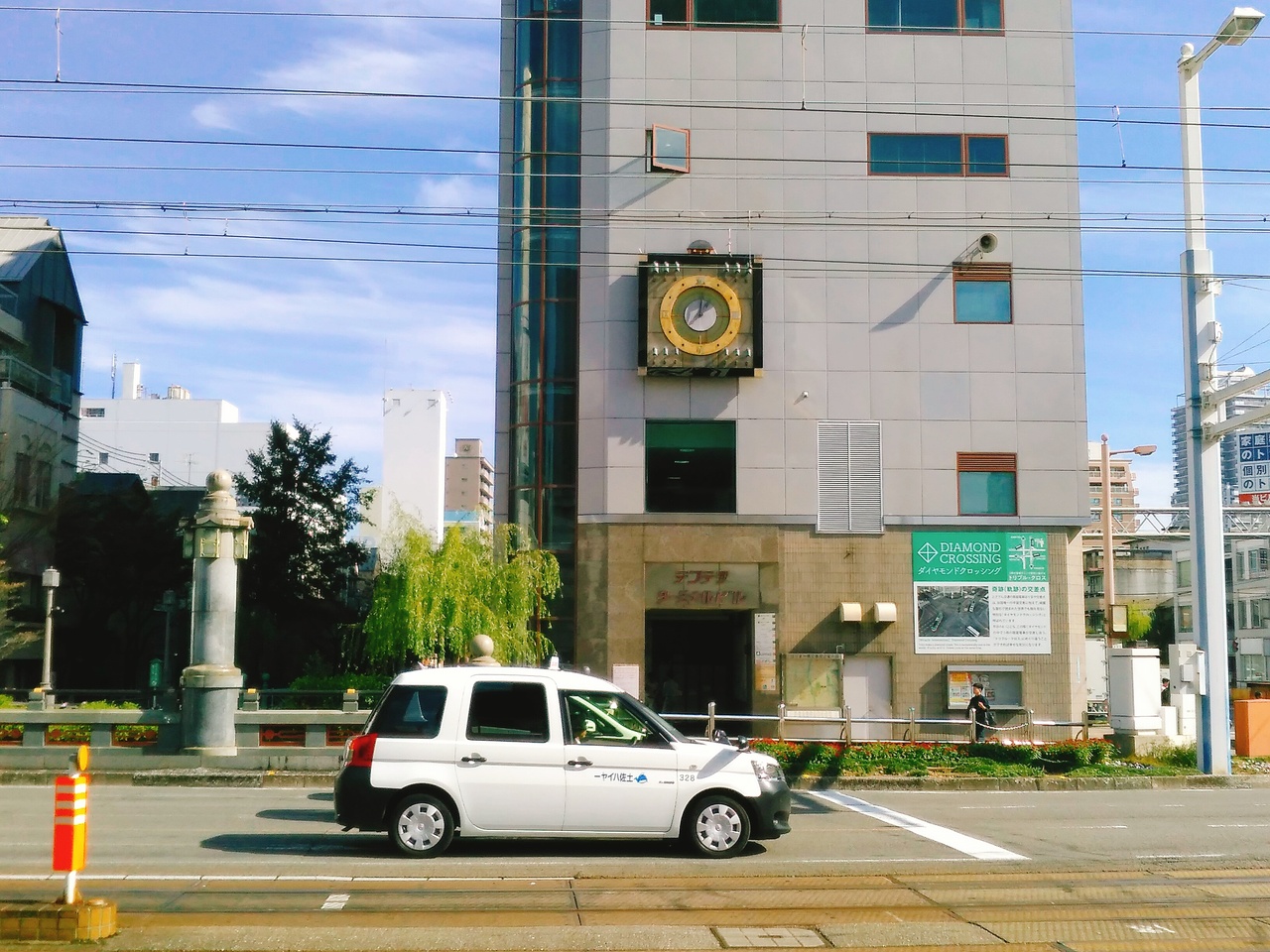 はりやま橋の道路を挟んだ向かえのビルの壁にからくり時計が掛かっています。よく見ないと気付きません。からくり時計、本来は1時間おきに、よさこい節の音楽にのってからくりが動くようですが、行った時期は内部機械の更新工事が行われていて流れませんでした。はりやま橋の近くに貼り紙がありました。