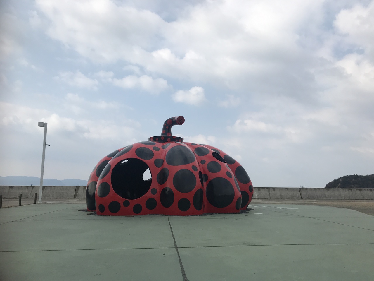 有名な黄色南瓜より大きめです。中も入れ、順番に写真を撮ってました。フェリー乗り場の隣にあり、乗船前後だと人が多いかもしれません。黄色のカボチャとはまた違った魅力のあるアート作品です。家族連れの方も楽しく撮られてました。