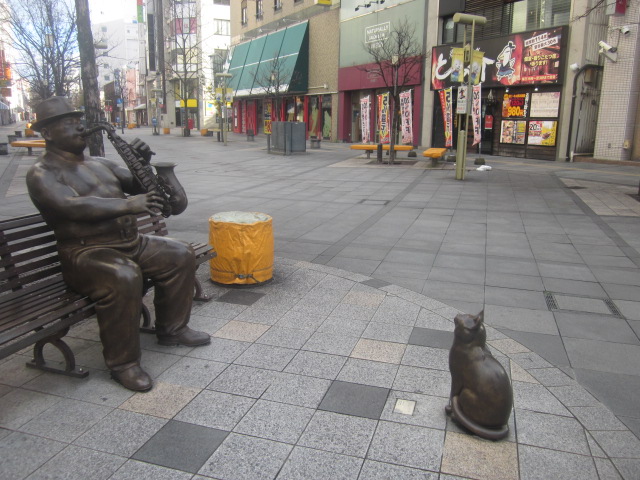サックスの内部はどうなっているのかな?と、覗き込んでみると、何と吸い殻を発見…。うーん、どうしてこんな品のないことをしてしまうんでしょうかね。確かに入れ物みたいになっているし、銅像なので金属製ということで、火災の心配も少ないでしょうけど、ここに吸い殻を放り込んでしまう人の神経が信じられません。清々しい晩秋の空気とは裏腹に、何か後味の悪さを感じた朝となってしまいました。良識ある皆様は、絶対に真似をしないで下さいね…。