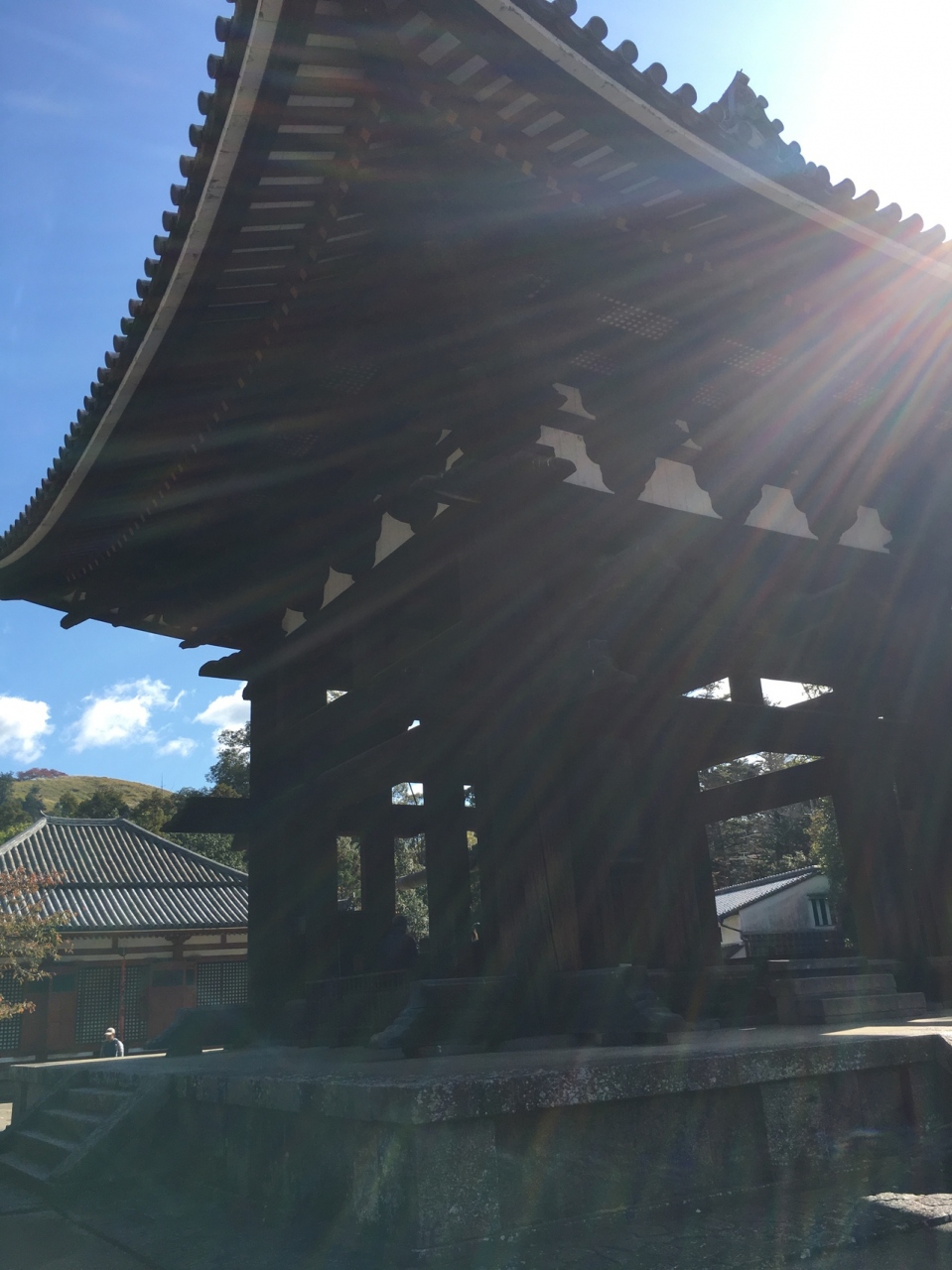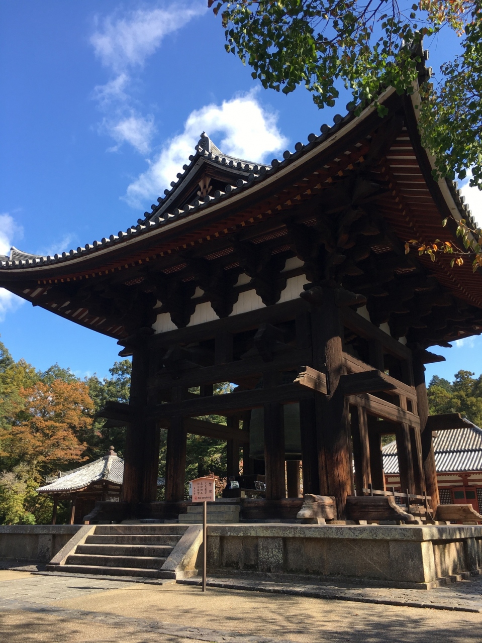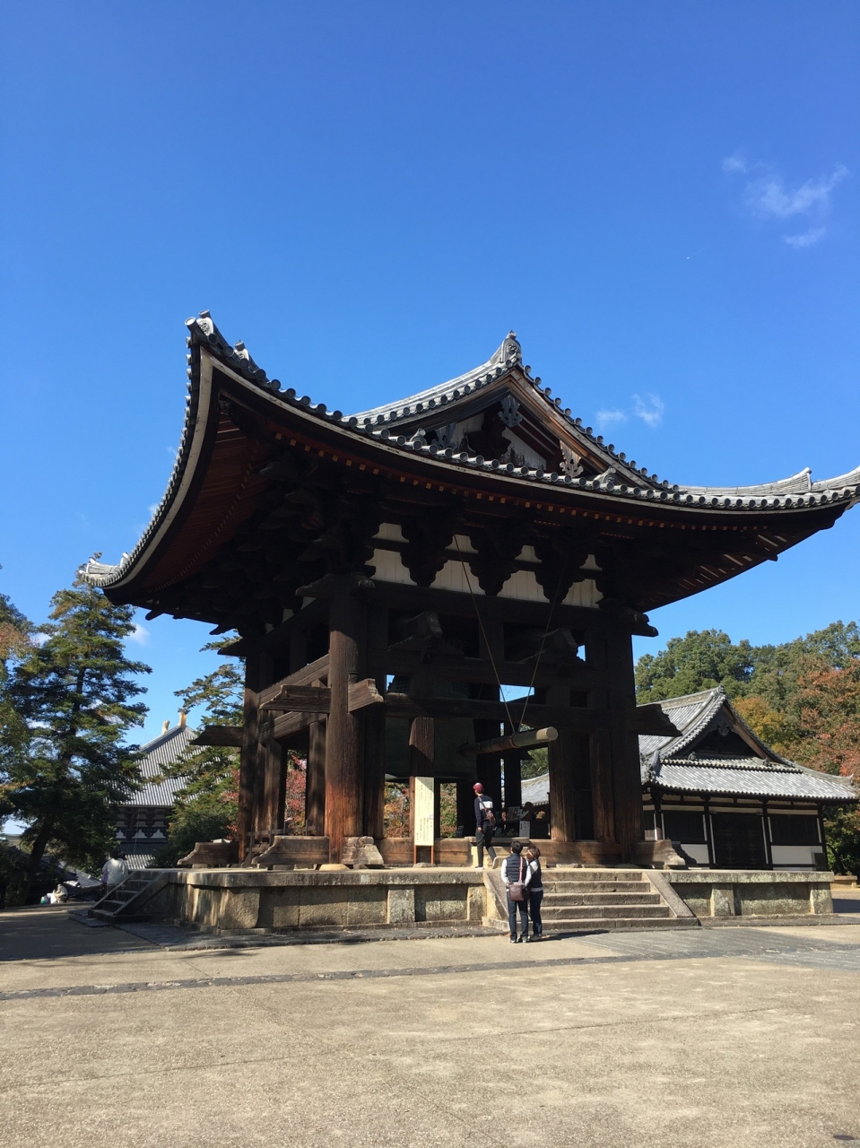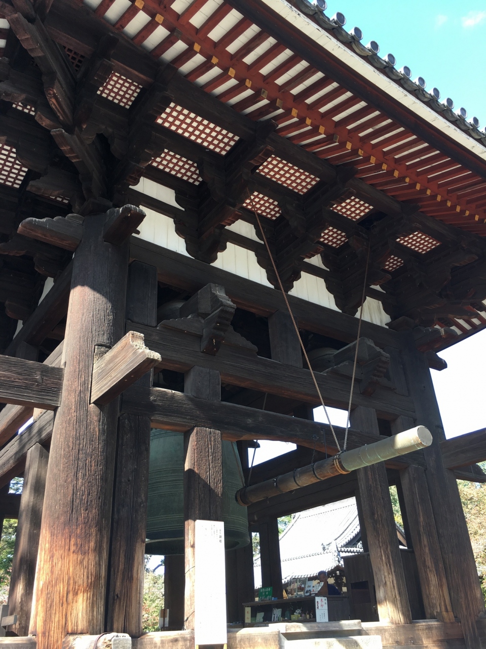 石の土台に建っていて階段を5段ぐらい上がり、鐘の真下まで行けます。建物は敷居がなく柱だけなので鐘をどの方向からも見ることが出来ます。建物の中に簡易的に何か販売していて、販売員もいて、面白い光景でした。