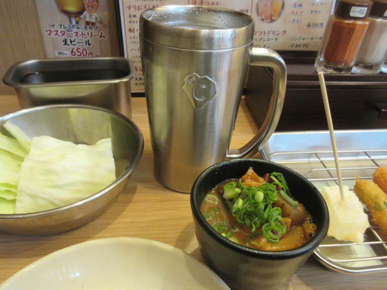 串カツのセットと、どて焼き、生ビールをお昼から楽しむことができました。