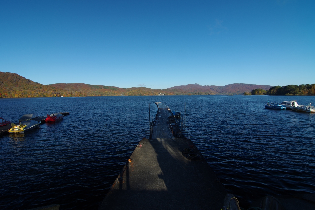 清冽な空気の中に佇む紺色の湖面、紅葉もきれい