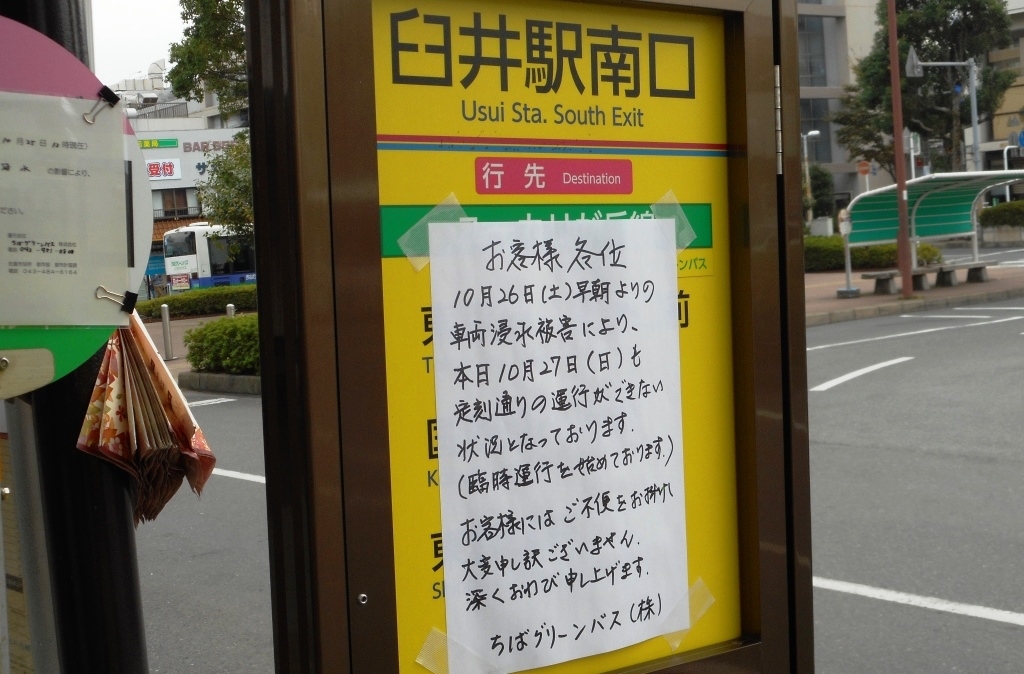 特に、このちばグリーンバスは、本拠である田町車庫が水没し、大打撃を受けた。事前にいくらかのバスは高台の各車庫や折り返し場に避難したのだが、少なからぬバスが冠水しダメージ。