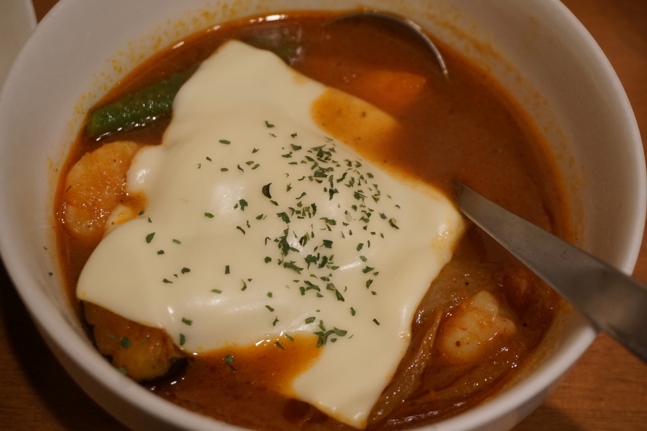 辛さが選べるのですが、初めてだったので、カレー初心者のランクを注文。トマトのカレーがどうかするとトマトスープみたいな感じでしたが、それでもこのコクのうまさはなかなかのもの。素直な味わいとともに深く印象に残りました。神田のカレーのレベルの高さを証明しているようなお店です。