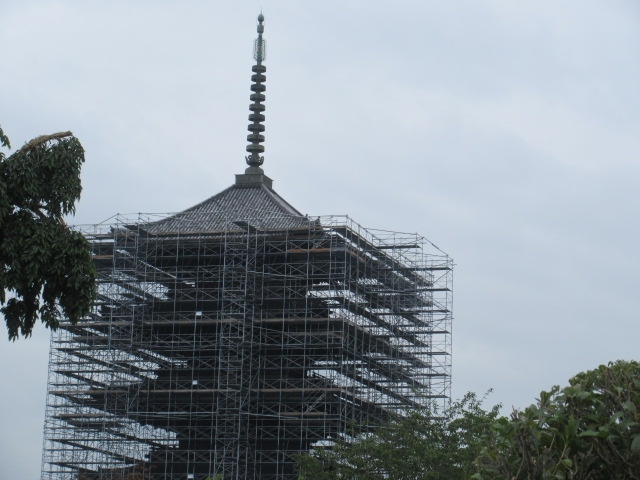 京都の東寺に行きました。東寺にはこの大きな五重塔があって、木造建築では一番高い55メートルだそうです。周囲に高いビルがないこともあって、遠くからでもよく見えます。行ったときは保守工事中とのことで、塔の周辺には足場があって残念でしたが、現在で5代目の建物。長持ちするといいですね。