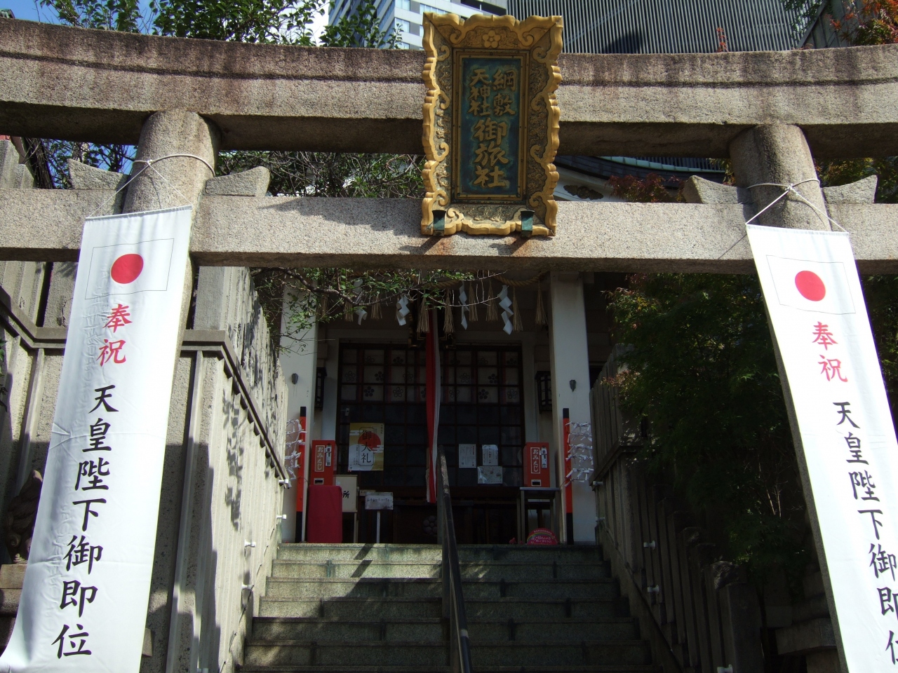 阪急電車の大阪梅田駅から十三方向へ線路沿いを歩いていくと、ビルの間に突然鳥居が現れます。急な石段の上にお宮がありますが、少し離れた神山町にある神社の御旅社だそうです。天神社なので学問の神様、菅原道真公が祀られ、お祭りの時は賑やかになりそうです。
