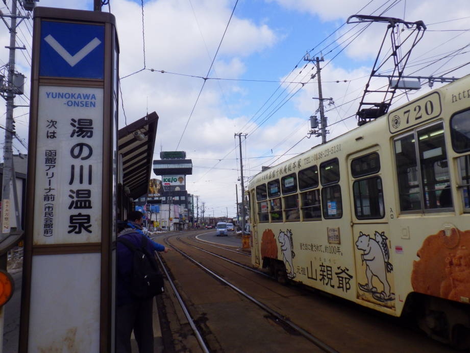 ホテル万惣に荷物を預けてから、湯の川温泉駅まで歩いて市電に乗りました。市電は一駅先の湯の川駅から出ているようですが、来た市電の車内は老人と外国人でいっぱいで座れませんでした。函館までは結構乗るので、湯の川駅まで歩いたほうがいいと思いました。