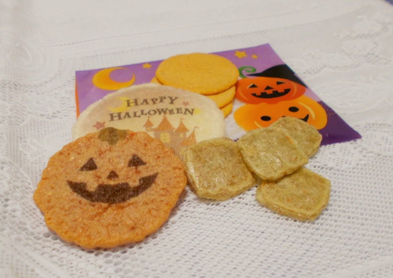 ハロウィン1枚とかぼちゃお化け1枚と南瓜えびせんべい3枚と緑松風4枚入。