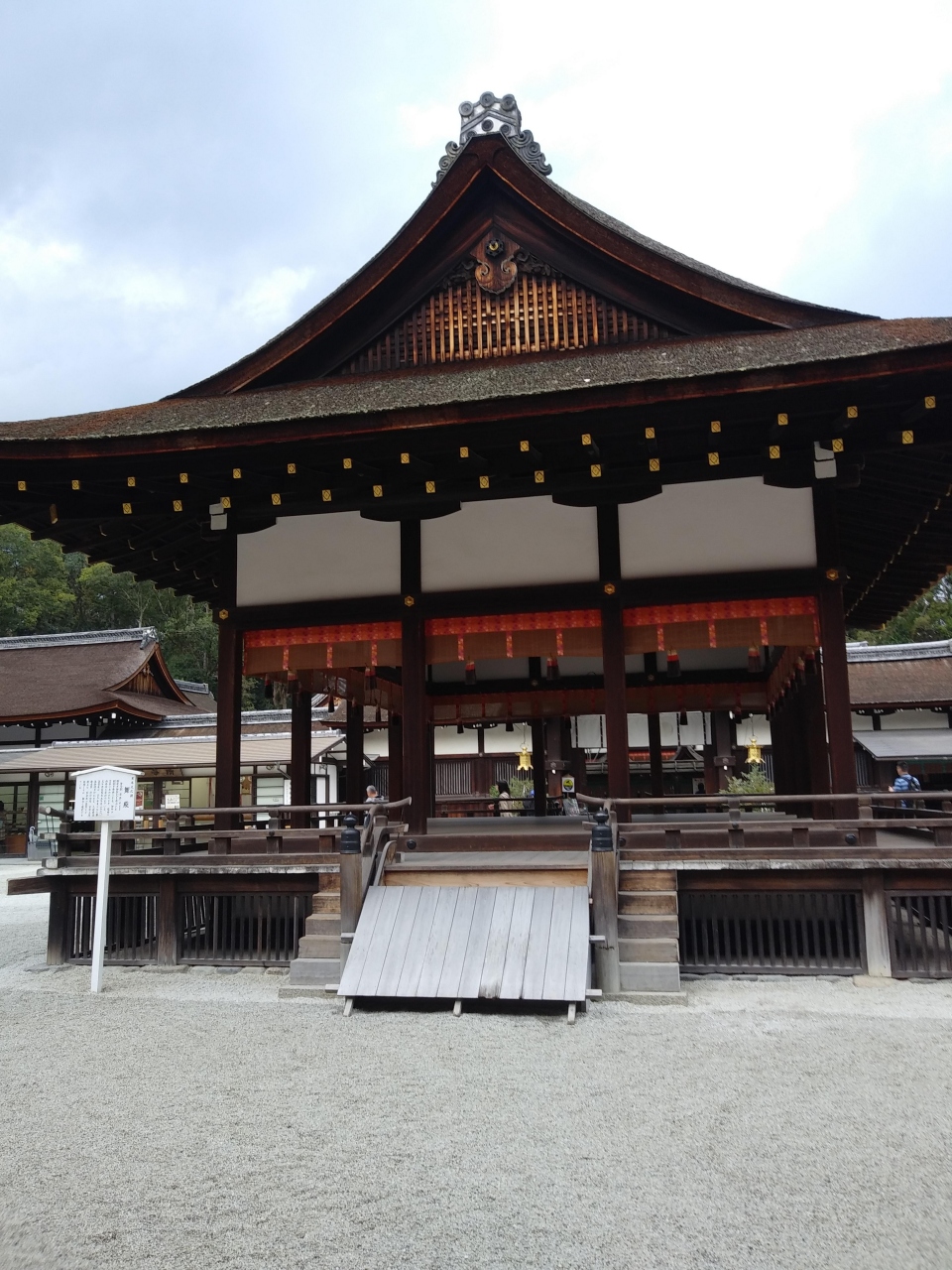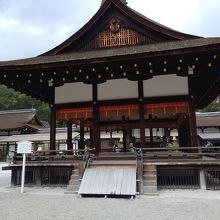 舞殿はいろんな大きな神社でよく見ますが、どちらも神事のときにだけ使う建物みたいです。楼門や本殿ほど朱塗りが強くはありませんが、真ん中の朱塗りがとてもきれいで見ごたえありました。