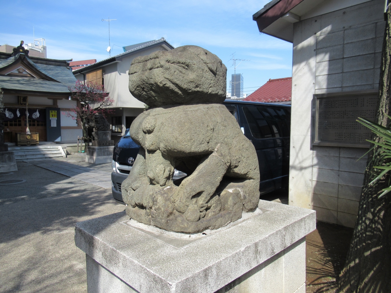 鳥居をくぐりますと独特の形状の狛犬さまが目に入ります。