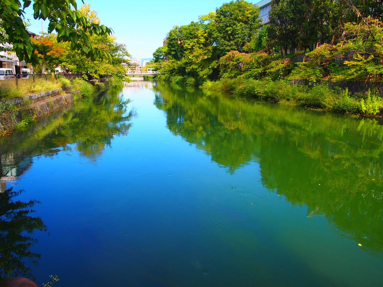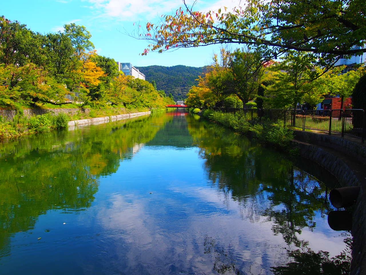 果たしてどこからどこまでを岡崎公園と呼ぶのか定かではありませんが、平安神宮や京都近代美術館を含む一帯と認識しています。東南の端は間違いなく岡崎疎水だと思いますが、訪れたときは水面に青い空が映り見事でした。