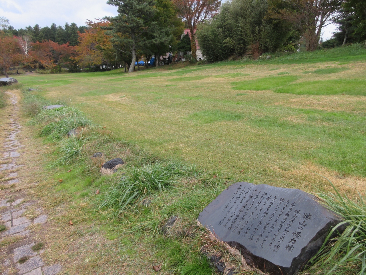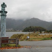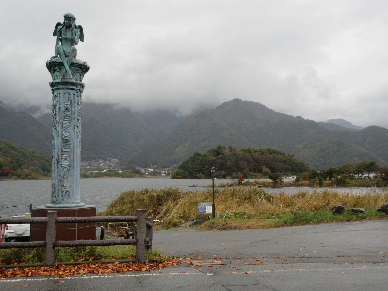 河口湖畔に数ある公園の一つで、刈り取られた草地が広がっています。児童遊具はなく、草地には、風呂桶を抱えて湖畔に行き、水を入れて担いで自宅に戻った怪力嫁の碑や、雨を呼ぶと言われた富士御室浅間神社の龍の話が刻まれた碑などが建っています。野鳥もやってくる公園で、野鳥の観察地にもなっています。公園はわかりにくい場所にありますが、訪れる場合は入口に建つ天使の像が目印になります。