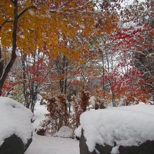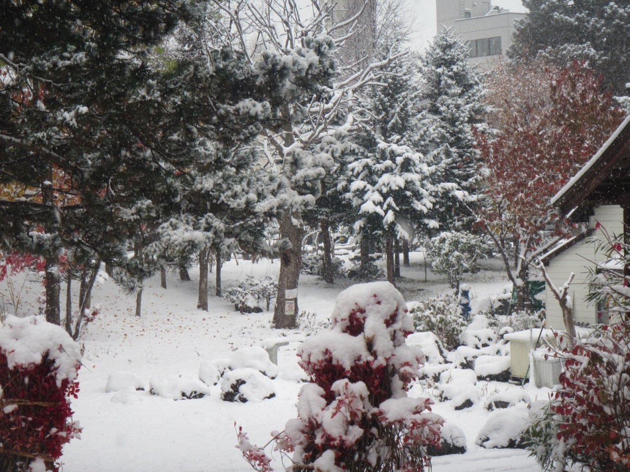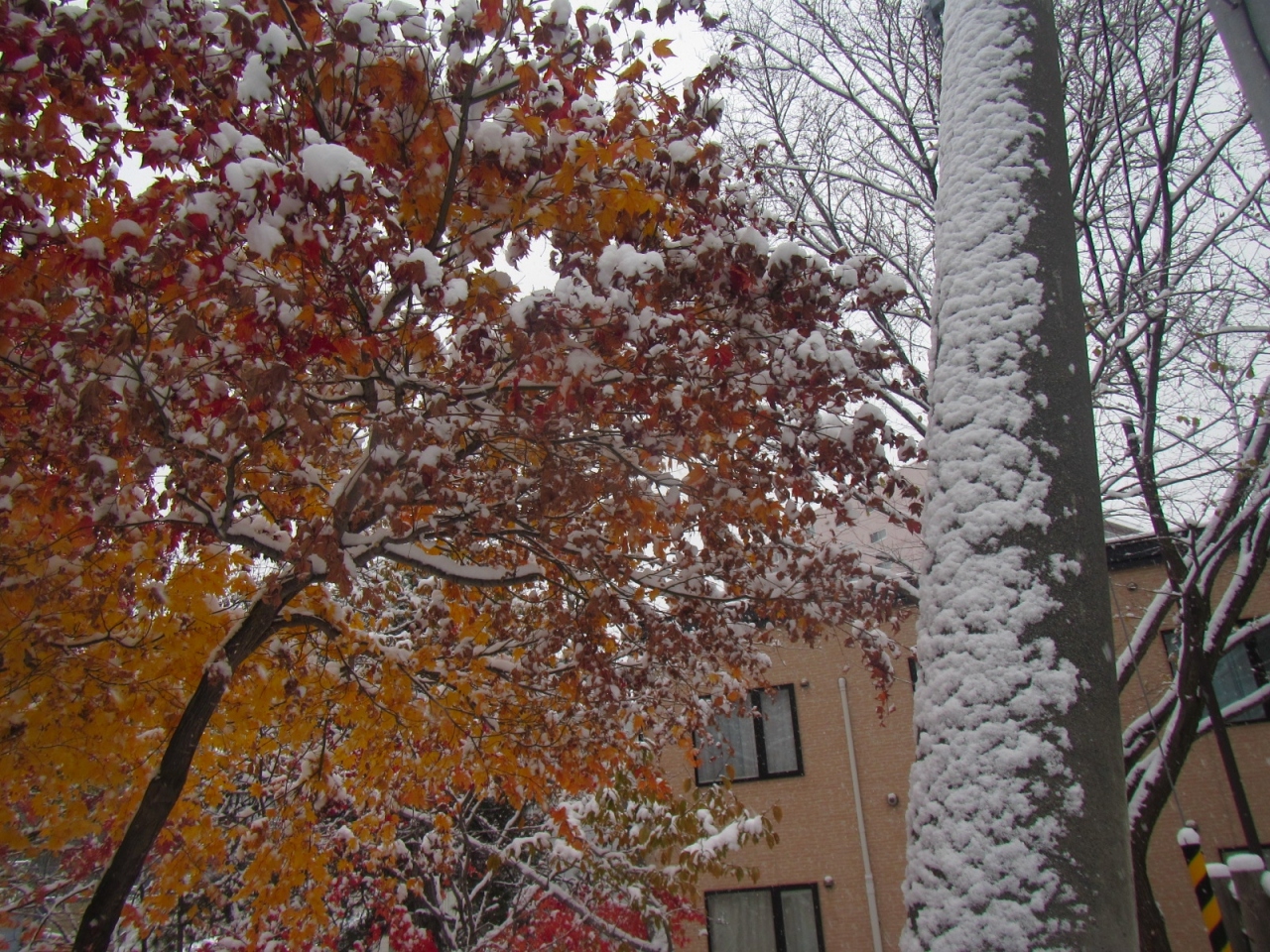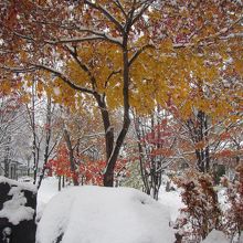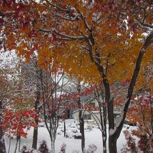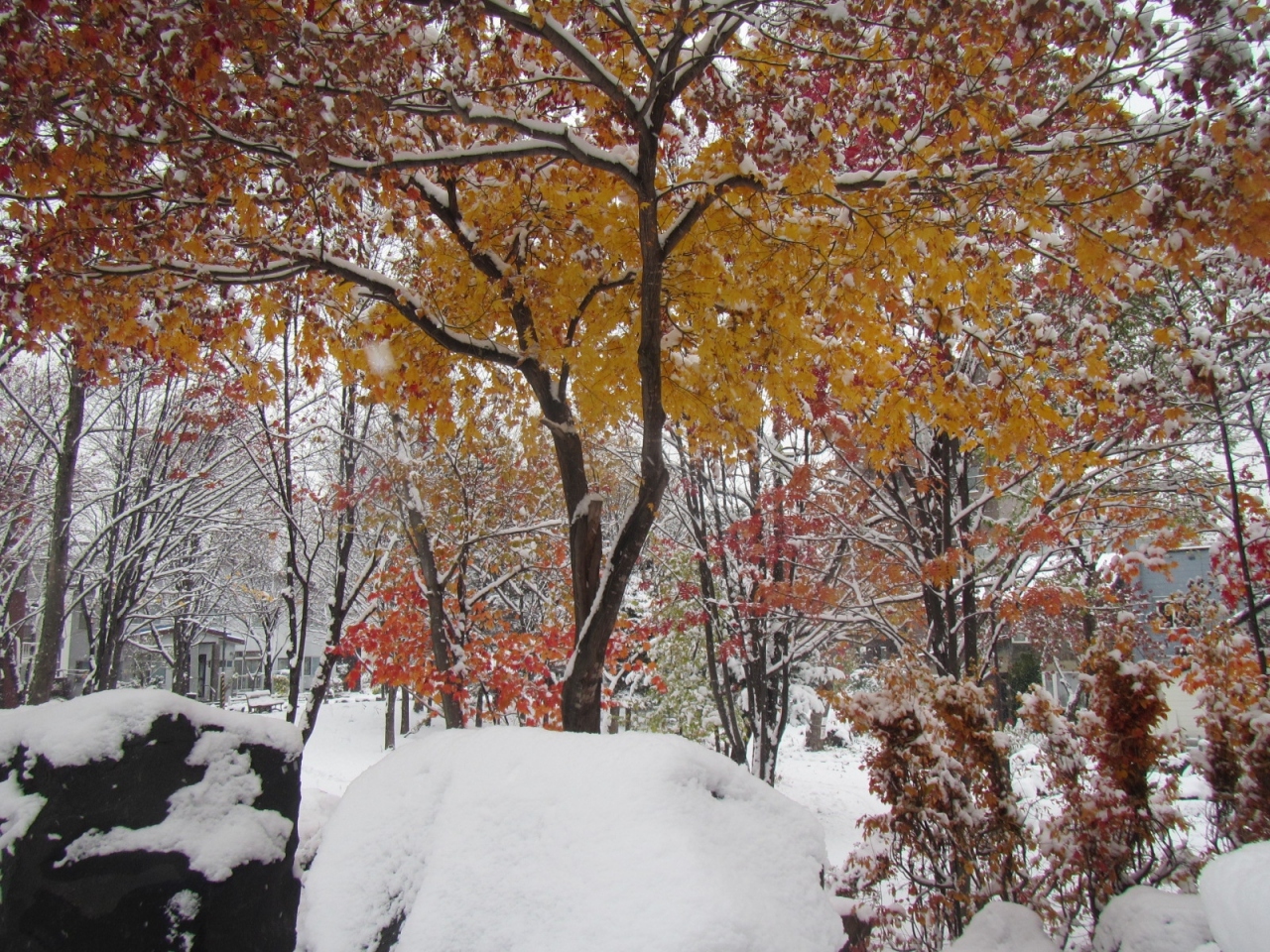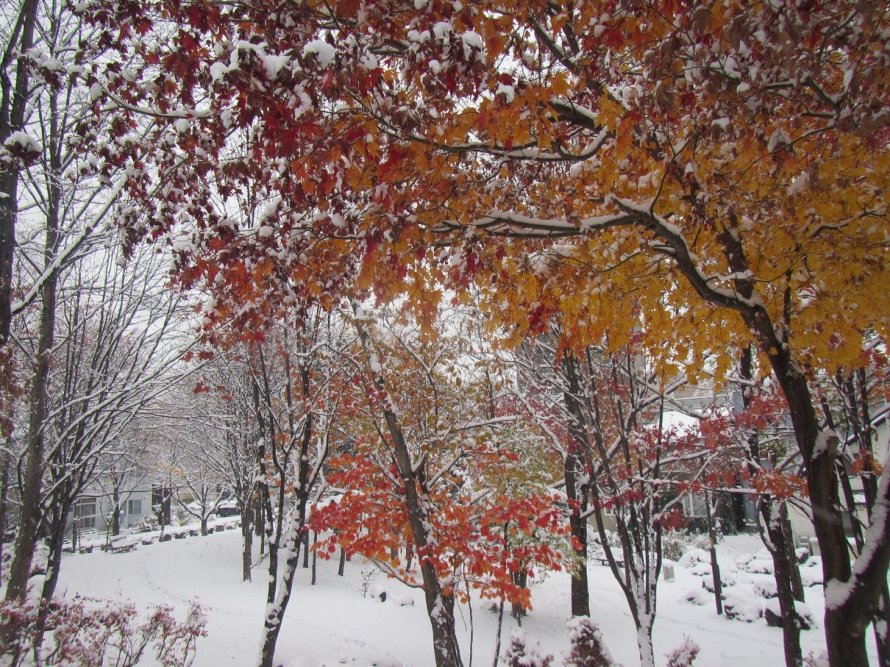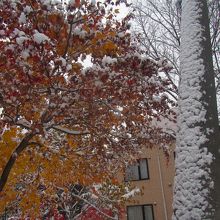 11月中旬、市街地の建物に囲まれているためか、まだ紅葉が残っている木もあり、葉が散る前に本格的な冬の季節を迎え、紅葉を雪のコラボを楽しむことができました。