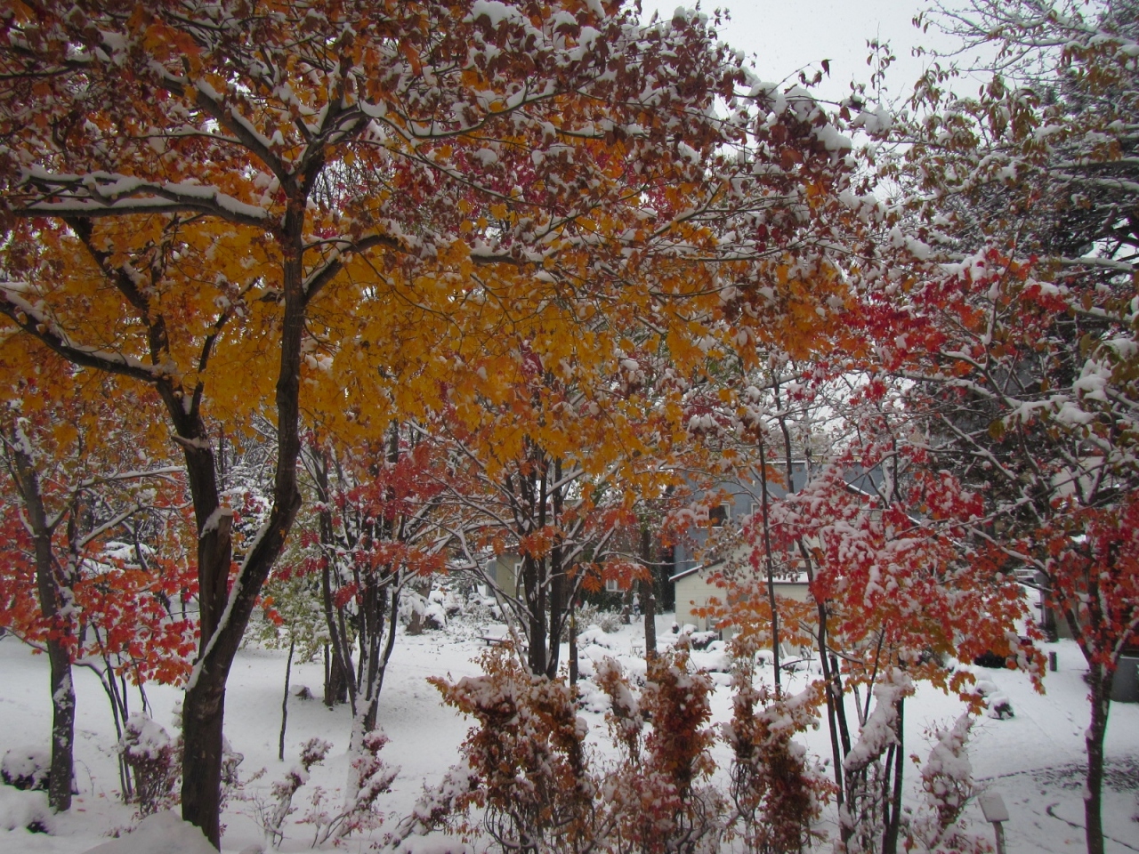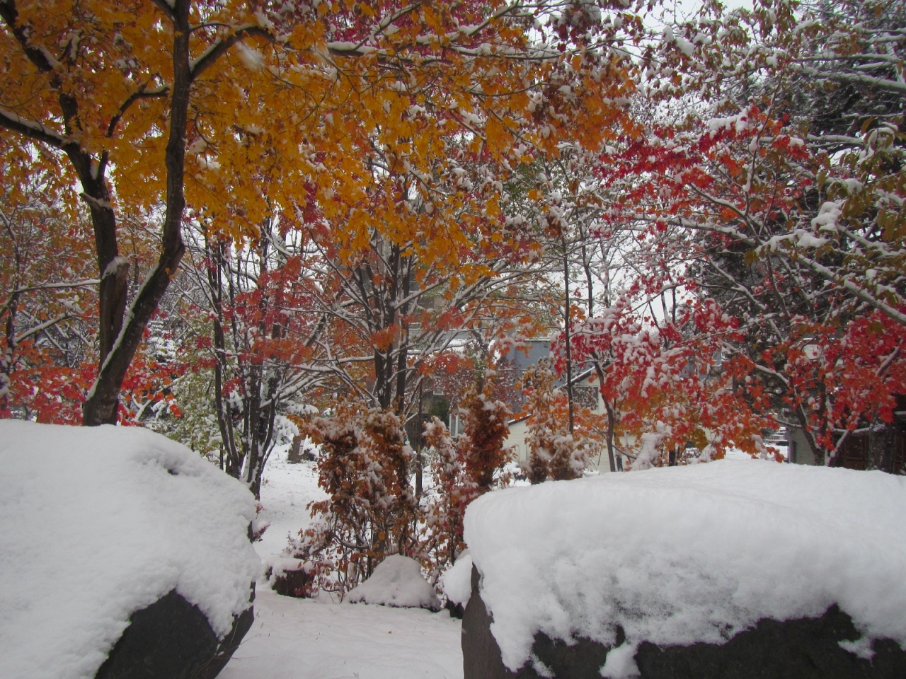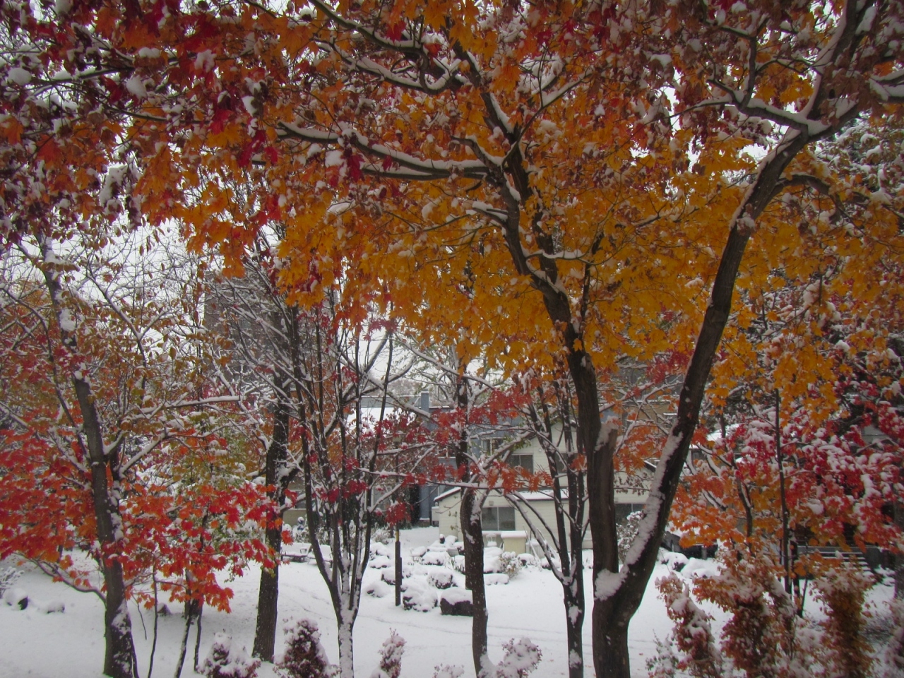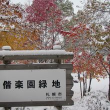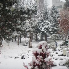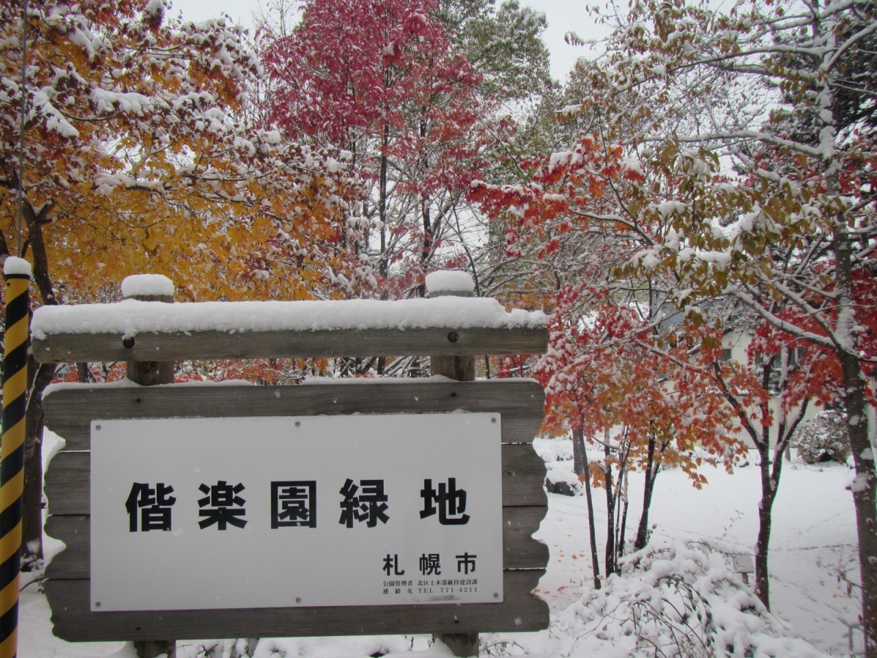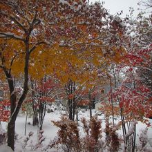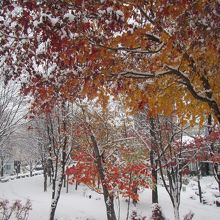 11月中旬、市街地の建物に囲まれているためか、まだ紅葉が残っている木もあり、葉が散る前に本格的な冬の季節を迎え、紅葉を雪のコラボを楽しむことができました。