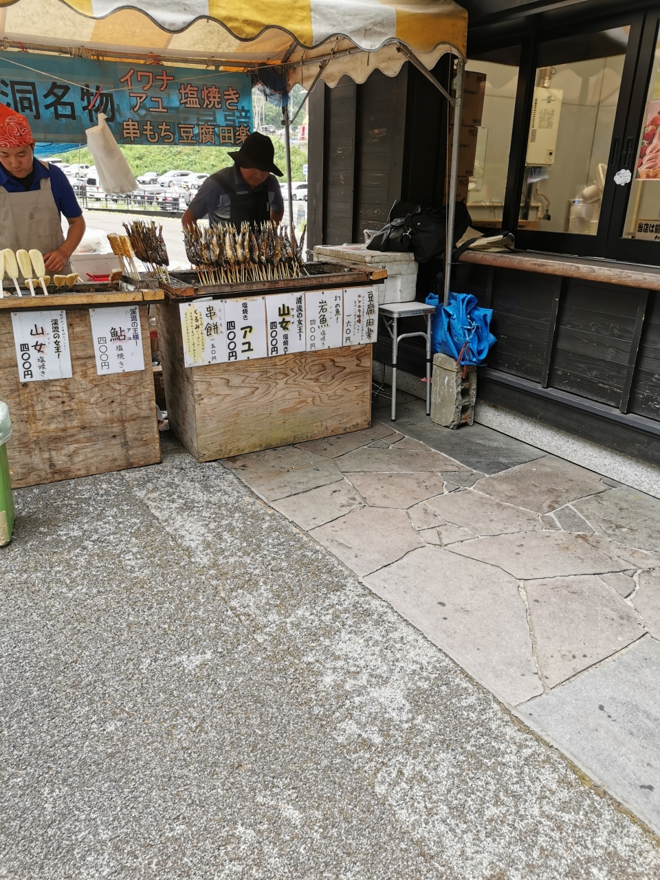 夏の東北旅行。自動車での一人旅。宮城県松島を早朝4時に出発、牡鹿半島、女川、南三陸、釜石、宮古、たろうを45号線で北上。15時30分過ぎに「龍泉洞」に到着。夕方近いですが観光客でいっぱいです。無料の駐車場も多数。問題なく泊められます。川沿いにある雰囲気の良い建物です。無料休憩所あり。川魚の塩焼きも販売。良い場所です。