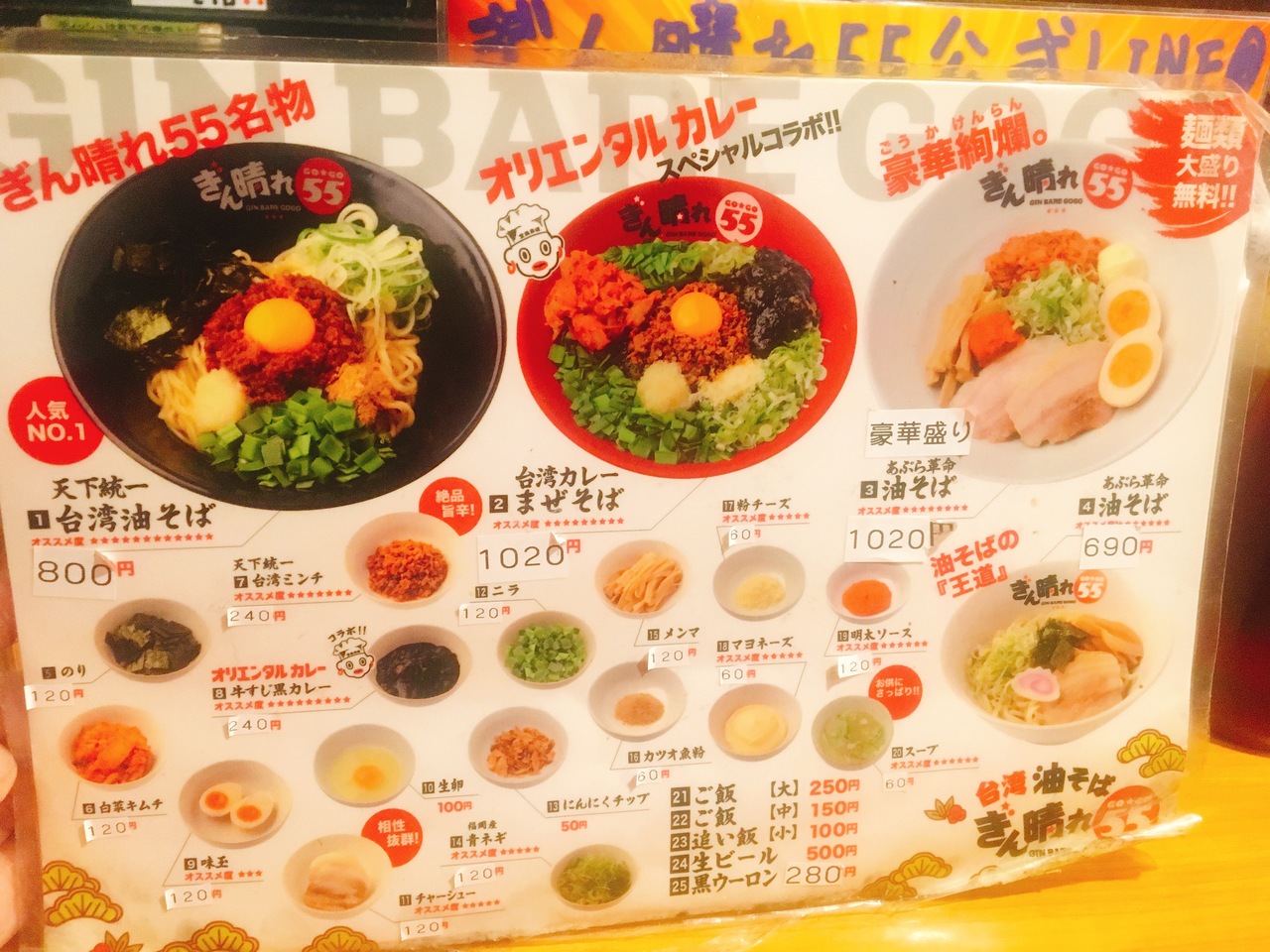 以前から存在は知っていたが今回が初訪問。よく見ると店の名前は3人の共同経営店から付けたらしくぎんや、晴れる屋、フジヤマ55のオーナー?らしき人達の写真が店外にも店内にも飾られている。
