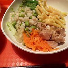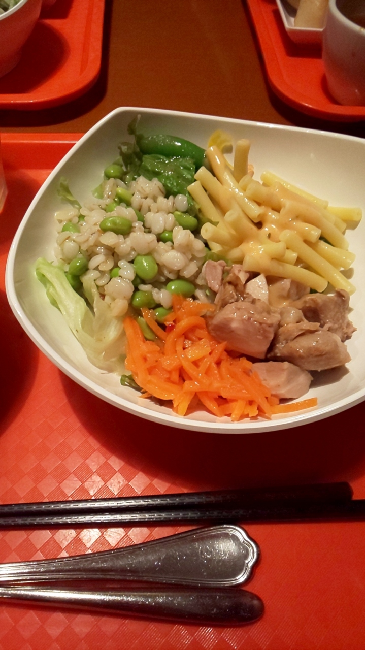 サラダ、ゴハン、スープの種類は三種類、パンはクロワッサン、ベーグル等数種類。ヨーグルトもあります。